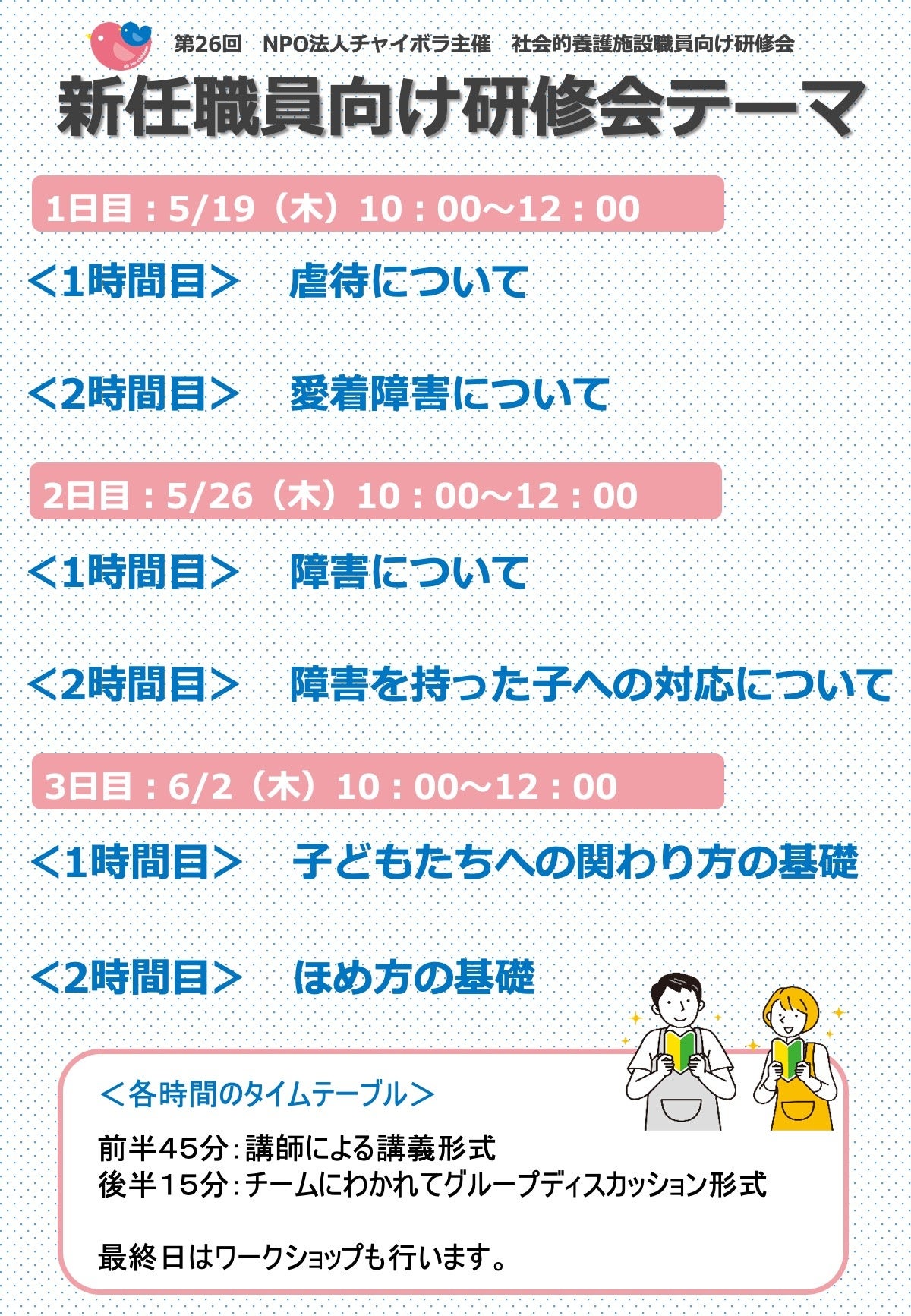 特定非営利活動法人チャイボラ(所在:東京都豊島区、代表理事:大山 遥、以下「チャイボラ」)は、2022年5月19日(木)から3回にわたり、全国の社会的養護施設の新任職員向け研修をオンラインで開催しました。「子どもとどうやって関わったら良いかわからない」「特性のある子どもとの適切な関わり方を知りたい」といった入職して間もない職員のかたからよくいただく悩みを解決するべく、施設職員として知っておくべき基本知識を講義とグループディスカッションの中で学んでいくプログラムです。