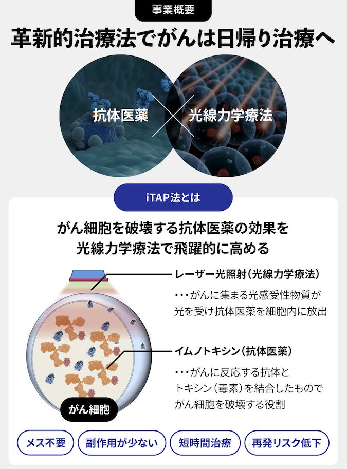 弊社は、抗体医薬と光線力学療法を組み合わせた新しいがん治療技術「iTAP法(アイタップ)」を開発しました。すでに基本特許による参入障壁を築き、東京大学や日本医科大学といった名門大と連携し実用化を目指しています。