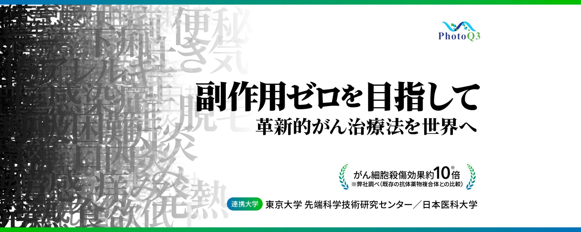 弊社社名PhotoQ3には、当社の研究開発の基本理念である、Quest(探求する)、Qualify(選びだす)、Quantify(定量化する)の3つのQと、治療のできない世界に光(Photo)を照らしたいという想いを込めております。