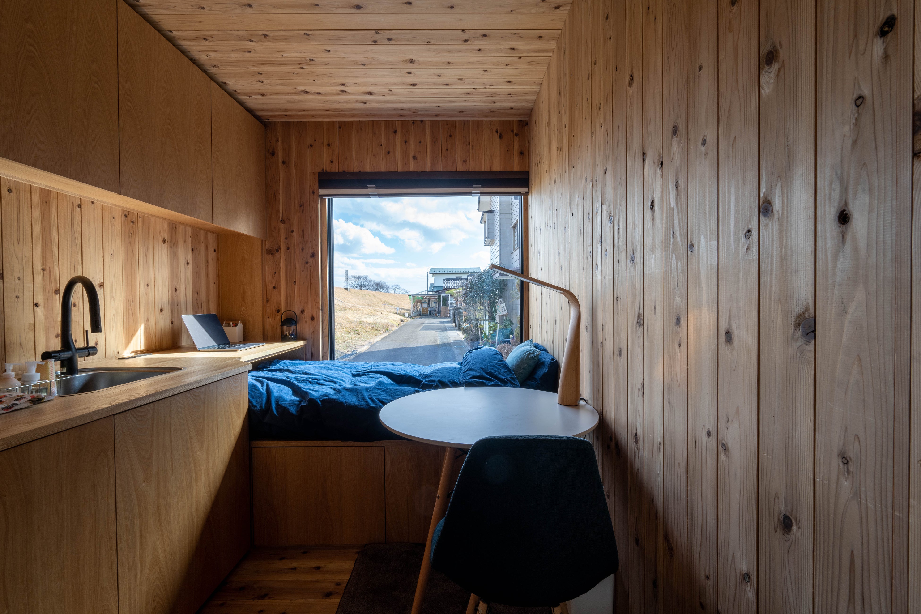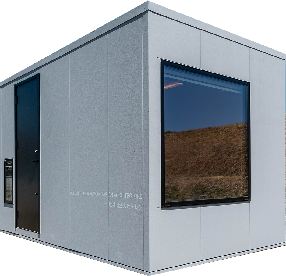 そこでヒトレンでは、縦ログ構法で建てた Capsule Box の活用を提案いたします。平時に於いては一時宿泊施設や、個人オフィス、店舗などとして全国に展開、確保しておき、避難者だけでなく、災害支援で長期滞在する支援者の宿泊施設としても活用できます。床面積を 10 ㎡以下に抑え、道路運送車両法内に収まる寸法で、シャシーに乗せればトレーラーハウスとして移動できます。体育館に雑魚寝するのではなく、長期避難時の生活空間から仮設住宅期、恒久住宅まで快適で安心して使える住宅ユニットが災害時に瞬時に提供されるような未来を目指しています!