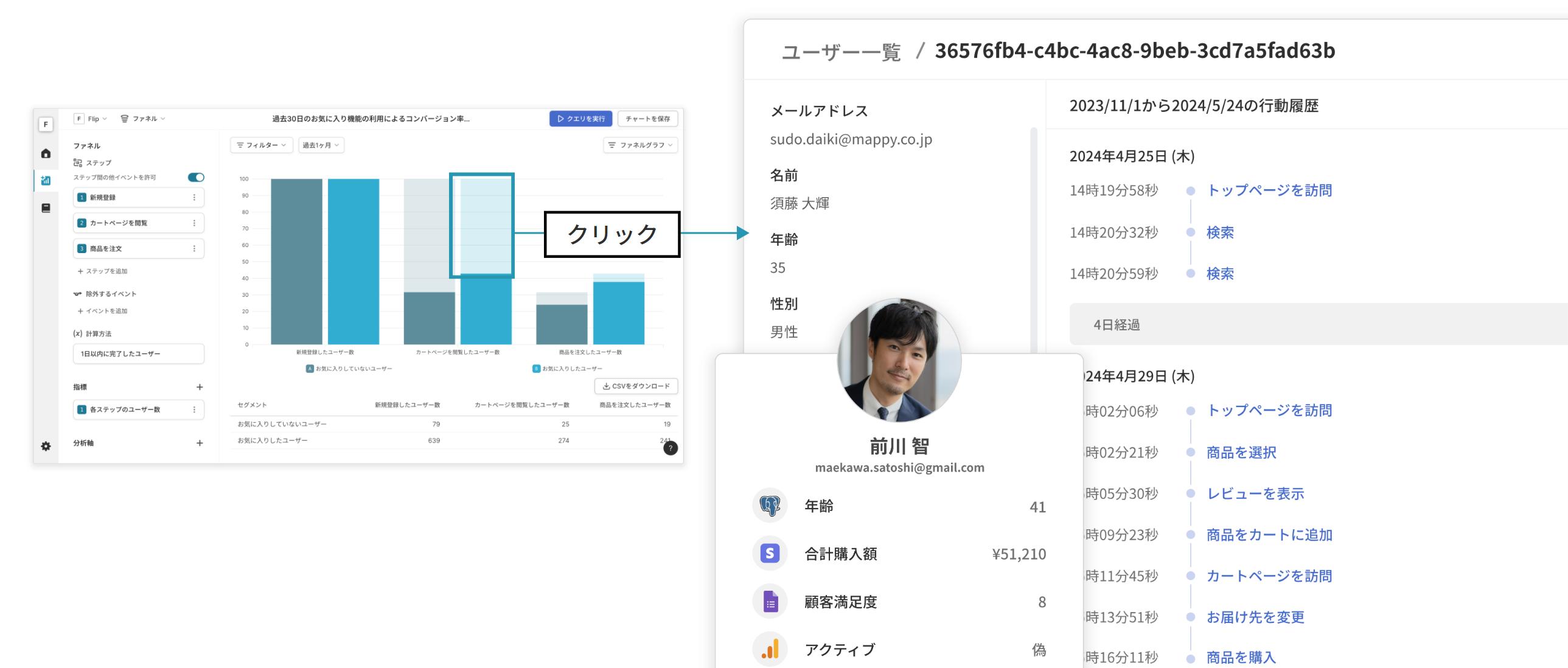 グラフ上で深掘りしたい箇所を選択するだけで、該当する顧客の行動履歴と属性情報を確認できます。定量データからは読み取れない、数字の裏に隠された一人一人のニーズを明らかにします。