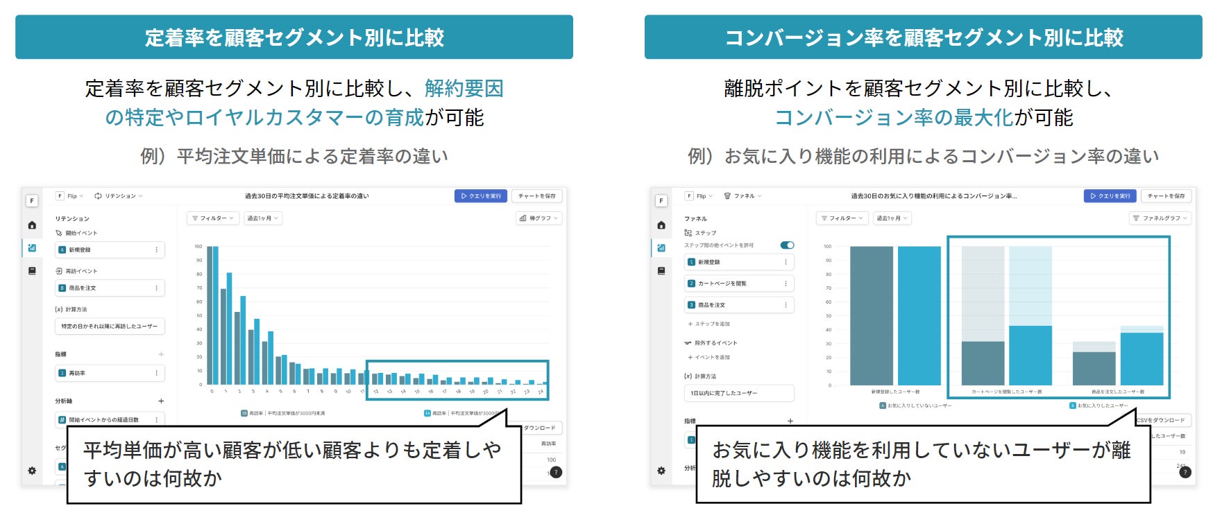 グロース分析とは、顧客セグメントによって異なるニーズを把握し、成長の機会を確実に捉える分析手法です。従来のアクセス解析ツールやコードを使用した分析手法とは異なり、Flipは属性データと行動データによって顧客を細分化(セグメンテーション)して分析することで、グロースのボトルネックを特定できます。