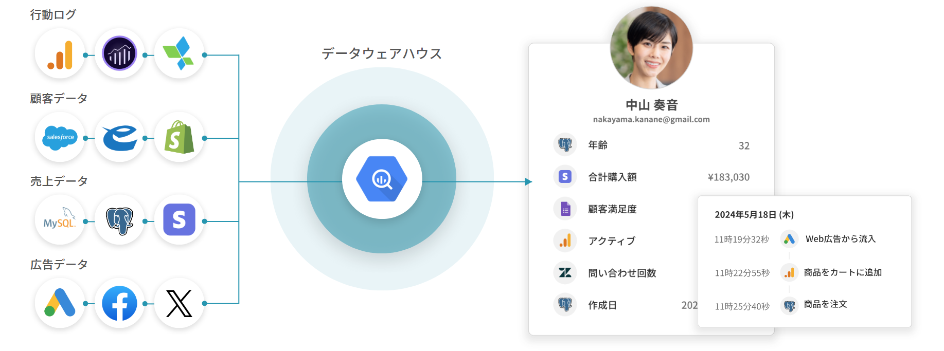 データウェアハウスに統合された多種大量のデータを連携することで、顧客を360°から理解できます。