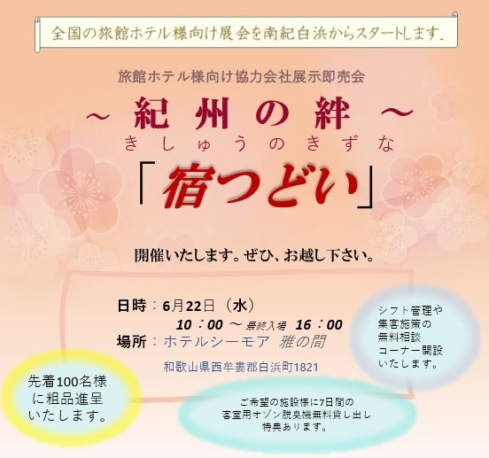 ホテル・旅館と関連業界とを結ぶ展示即売会を「宿つどい」として6月22日水曜日にホテルシーモア(所在地:和歌山県西牟婁郡白浜町)にて開催します。東京や大阪といった都市圏での大規模な展示会とは異なり、温泉街等での開催とすることで地元の旅館と納入業者と地域住民の新たな出会いが促進されます。