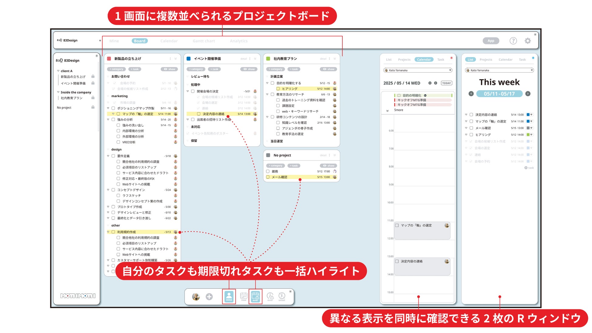 株式会社83Design(本社:東京都武蔵野市、代表取締役:矢野宏治)は、複数のプロジェクトの全体像と「やるべきこと」をひと目で把握できるタスク管理ツール『MOTHMOTH(モスモス)』のβ版を2025年6月にリリースいたしました。現在、全機能を2025年7月末まで無料でお試しいただけます。