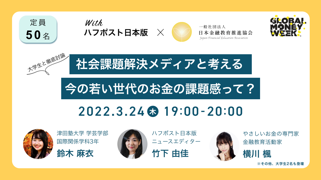 社会課題解決に向き合うメディア「ハフポスト日本版」の竹下由佳さんをお迎えし、現役大学生とともに、大学生を中心に今の若い世代のお金の課題感についてトークをしていきます。