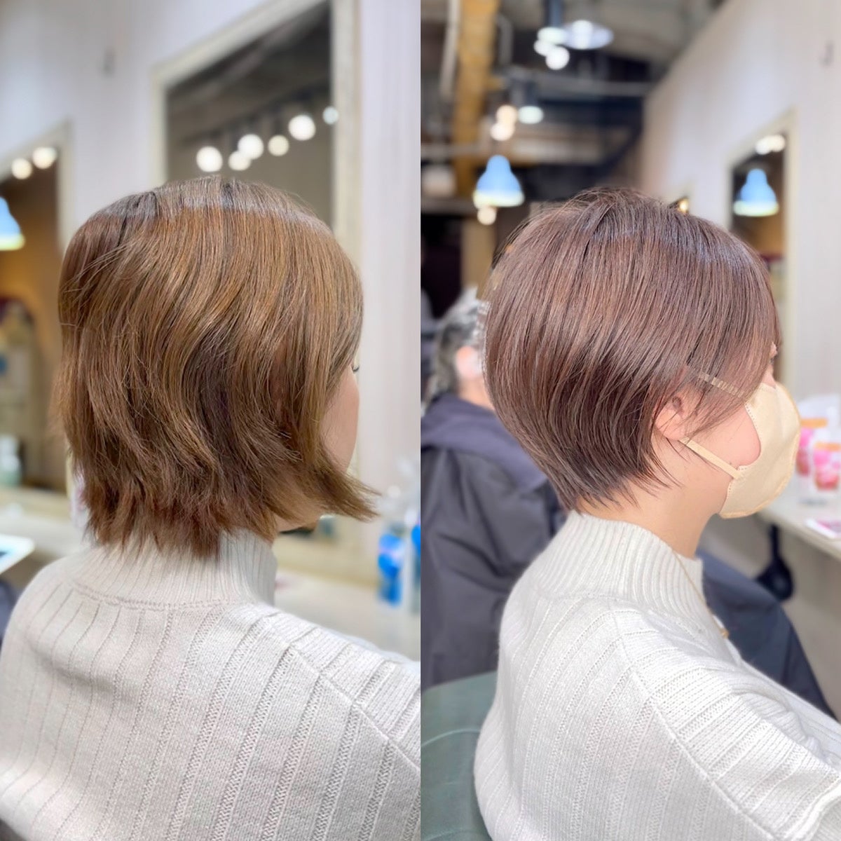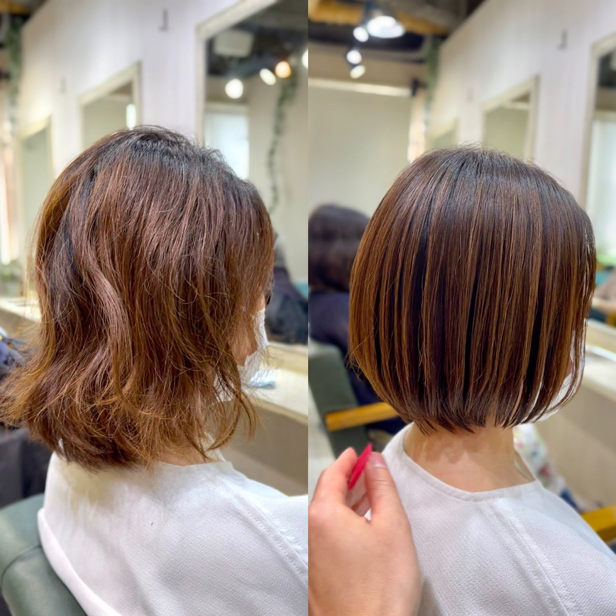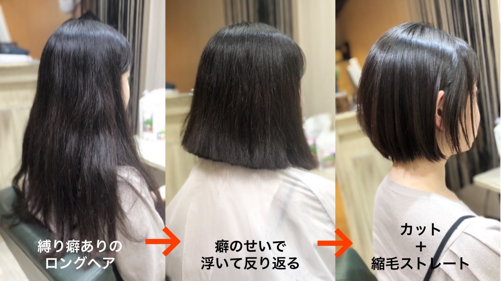 ピンピンな仕上がりは丸みが出ないのでショートスタイルには不向き。さらには、縛り癖で毛根が浮いてしまった髪にピンピンの縮毛矯正をしてしまうと、そのまま浮いたおかっぱになってしまいます。