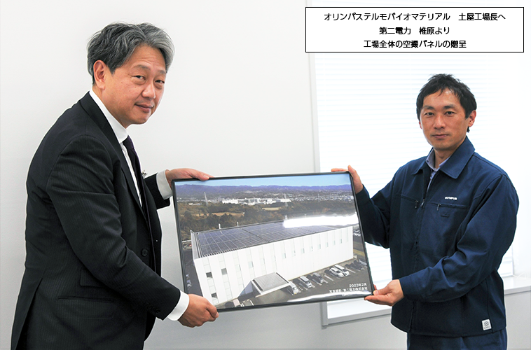 竣工式においては、第二電力 執行役員事業本部長の椎原より「まさしくここからが始まりであり、約束した発電量を確保できるように努めていきたい。オリンパステルモバイオマテリアル様は初期の発電状況もよく、立地環境からも太陽光に適した工場といえる。今回の導入がいい結果であったと評価いただけるよう弊社も努力していきたい。また、今回はオンサイトPPAという導入手法であったが、今後はオフサイトPPA等の新たなサービスを提案に加えることで、カーボンフリーの達成にむけて引き続き協力していきたい。」と挨拶した後、空撮パネルの贈呈を行いました。