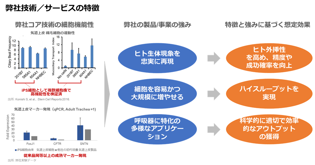 本サービスにより、呼吸器感染症領域において、ヒト外挿性の高い試験を行うことができるだけでなく、iPS細胞技術を活用することで従来のヒト肺細胞では難しかったスループットの高い解析が可能になります。