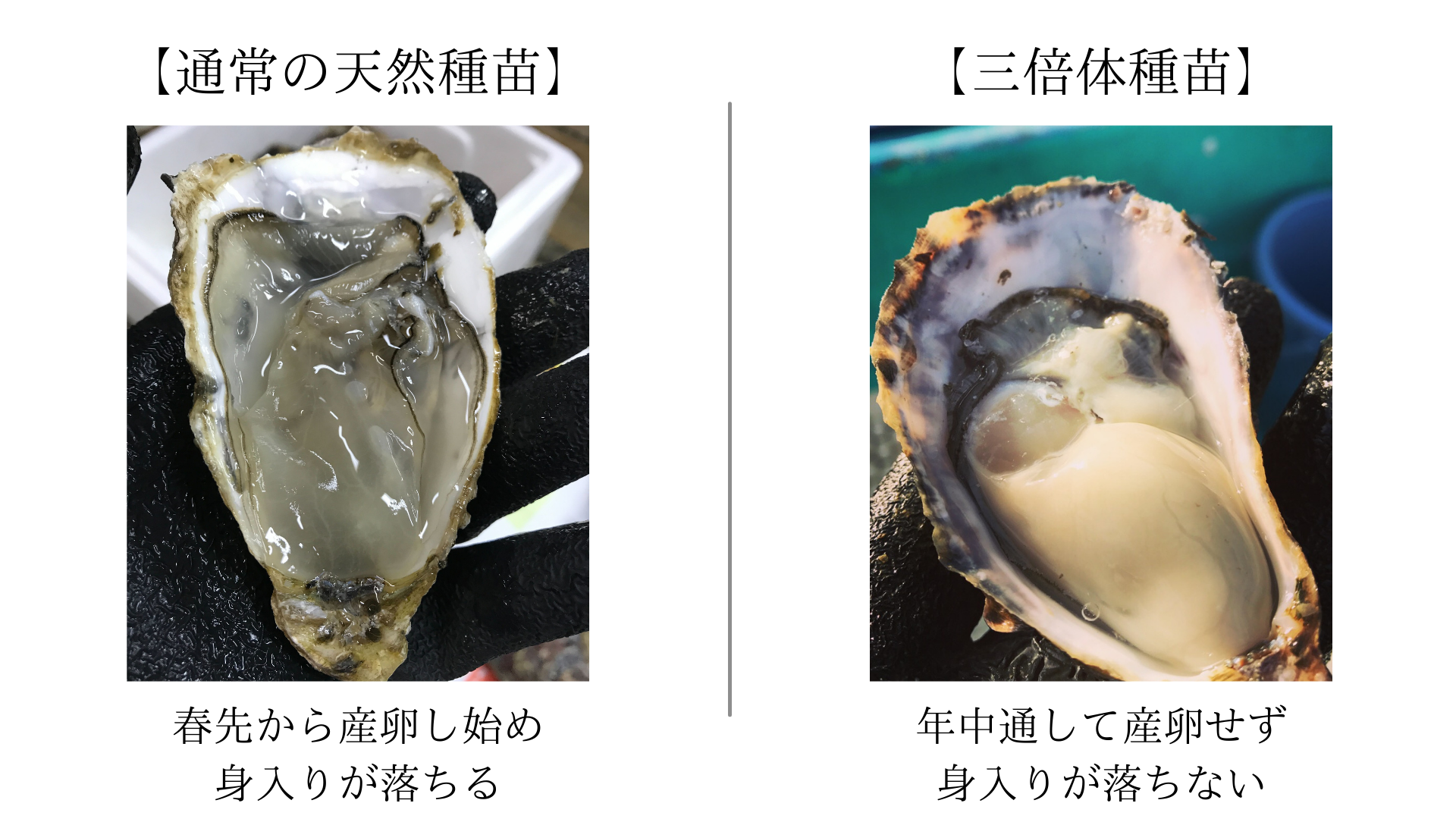 当社は、国内有数の牡蠣の人工採苗技術を保有しており、"三倍体"と言われる「産卵しない牡蠣」となっているため、年間を通して身質が落ちることなく、年中食べられる牡蠣となっております。