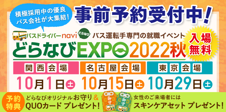 バス運転手専門の求人サイト『バスドライバーnavi(どらなび)』を運営するリッツMC株式会社は、10月1日(土)に大阪・グランフロント大阪で、10月15日(土)に名古屋・JRゲートタワーで、10月29日(土)に東京・新宿エルタワーで、バス運転手専門の就職イベント『どらなびEXPO2022秋』を開催致します。