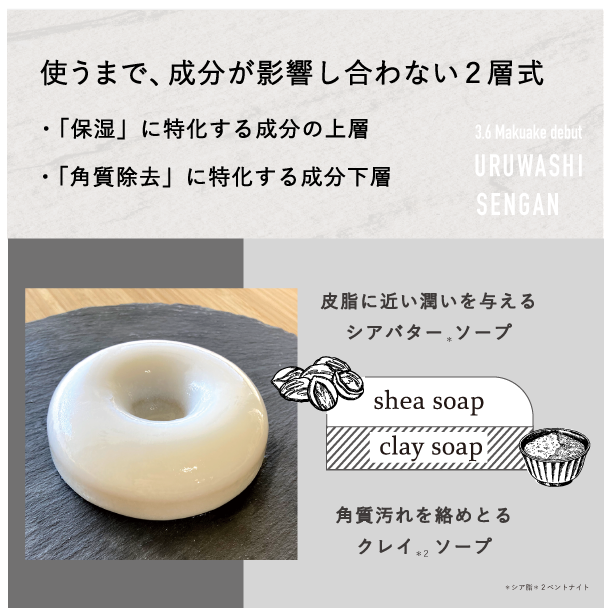 皮脂に近い潤いを与えるシアバターソープと角質汚れを絡めとるクレイソープの2層式。