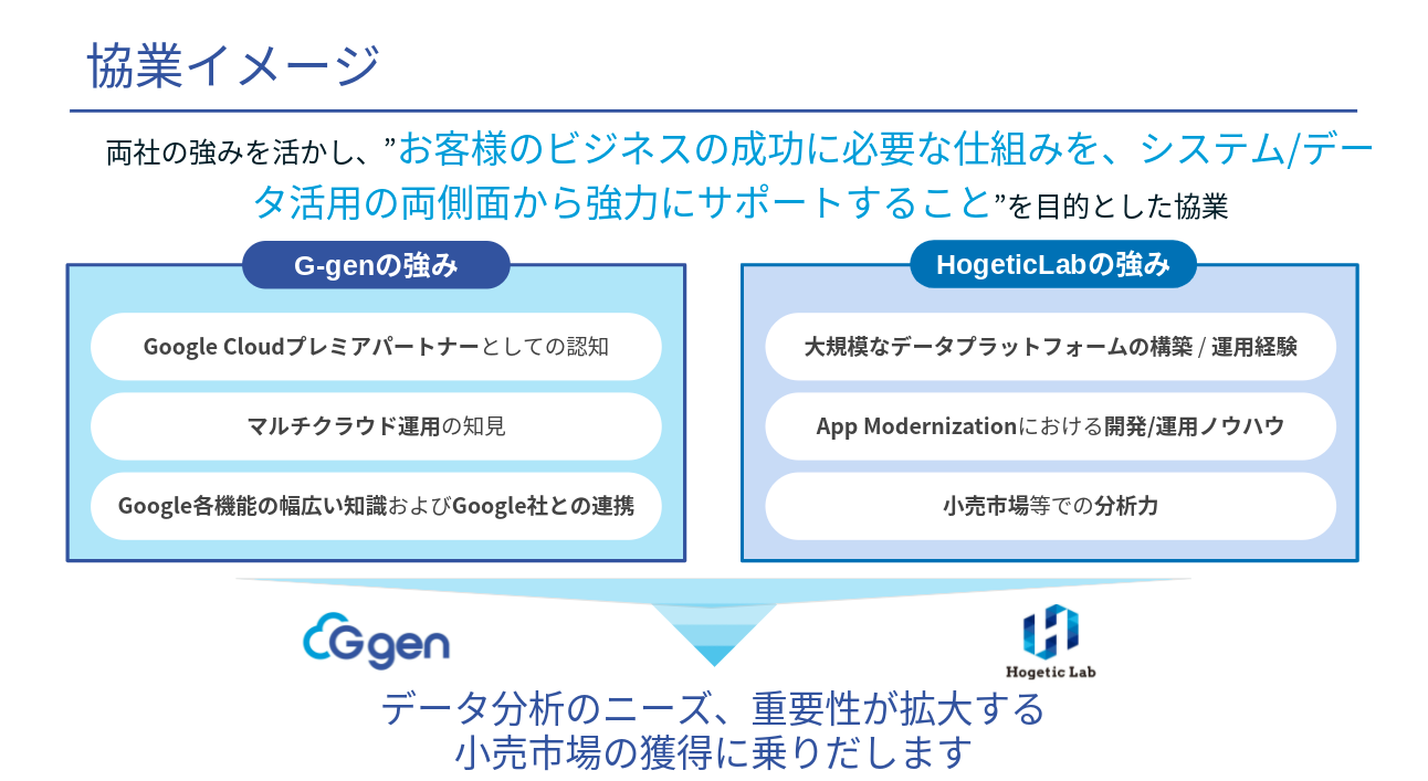 株式会社G-gen(本社:東京都新宿区、代表取締役:羽柴 孝) 、および株式会社HogeticLab(本社:東京都港区、代表取締役:大竹諒)はGoogle Cloudのデータ分析領域およびお客様のアプリケーションのモダナイゼーションの領域において、お客様経営基盤の構築を目的として協業いたします。
