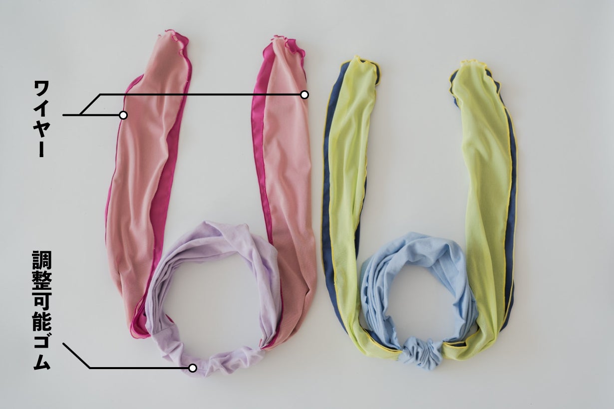 リボン部分にワイヤーを内蔵、後ろのゴムは調整可能となっておりそれぞれの頭に完全フィットしたつけ心地を実現しました。