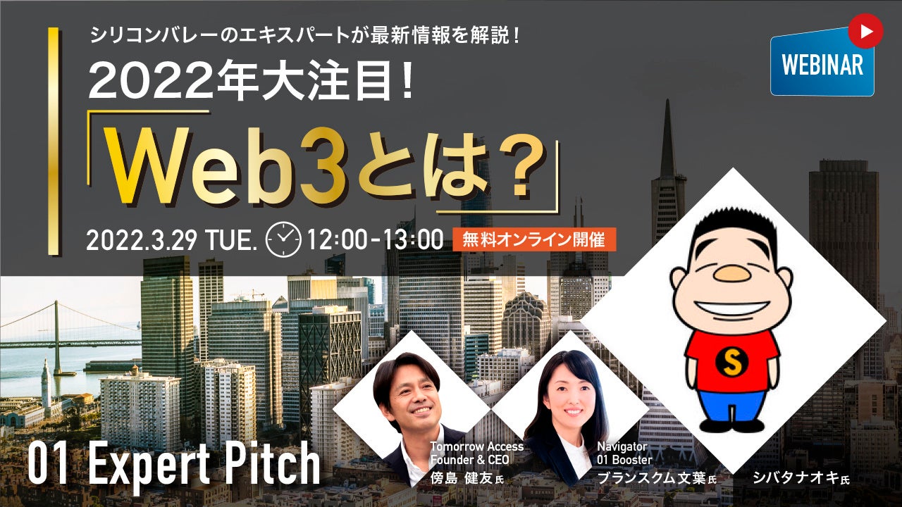 日本とシリコンバレーを繫ぐコンサルティング会社 Tomorrow Access LLC(本社:米国カリフォルニア、Founder & CEO:傍島 健友)は、株式会社ゼロワンブースター(本社:東京都千代田区、代表取締役:鈴木 規文)と共催で「Web3」をテーマにした無料オンラインウェビナー「01 Expert Pitch #9」を開催します。