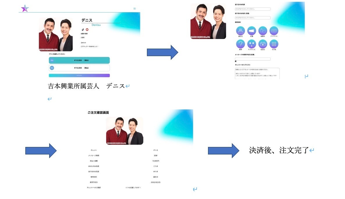 ビデオレターを注文したい著名人を選んでクリックいただくことで、その著名人のプロフィールページに移動し、注文するビデオレターの時間(30秒又は90秒)を選ぶことができます(注文の際、アカウント登録が必要です)。その後、フォームに注文内容をご入力、使用目的の選択、利用規約に同意していただきます。そしてカード情報の入力後、決済いただくことで、注文完了です。