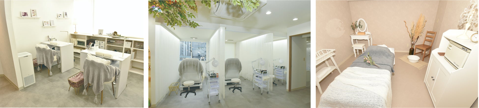 店内は感染対策も万全にネイル用に3つの半個室、マツエク用に3つの半個室、エステ用に4つの個室を備え