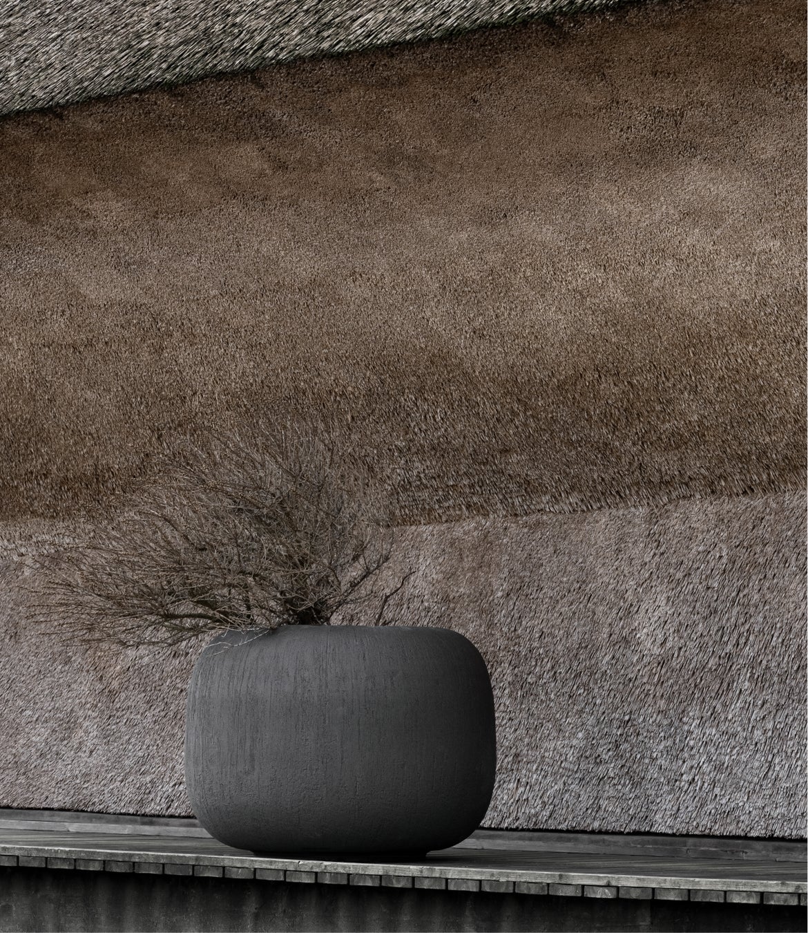 DOMANIでは新作コレクションを発表する際、コンセプトに合致する空間でプレゼンテーションを行います。「MELIDES」の舞台となったのは、デンマーク南部の北海沿いに位置する「Wadden Sea Centre(ワッデン・シー・センター)」。氷河期に形成された全長約500kmに及ぶ世界最大の干潟、ワッデン海国立公園の玄関口となり、ワッデン海の自然と歴史を伝える建物です。設計はデンマークの建築家、Dorte Mandrup(ドルテ・マンドラップ)が手掛けたもので、地元の伝統的な農家の建築様式と配置を参考とし、地元で調達した素材を採用。外壁から屋根まですべてをワラ葺きで仕上げて環境になじませながらも、コンテンポラリーな佇まいをかなえています。メランコリックな湿地帯と波打つ砂丘から上昇するように見えるこの建物は、ワッデン海の風景と見事に調和。素材やかたちによって人の心に訴え、物語を語るDorteの手法は、DOMANIが核心として取り入れ続けてきたものと共通し、「MELIDES」でもその真髄が感じられることでしょう。