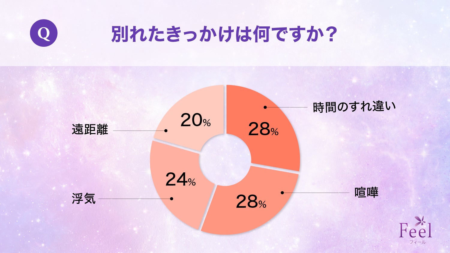 別れたきっかけは、全体で見ると「時間のすれ違い」と「喧嘩」が同票で多いという結果になりました。