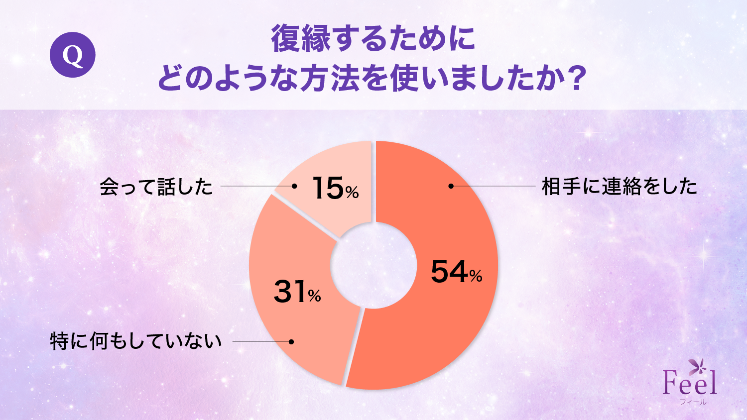 その反面「特に何もしていない」という意見も30%弱あり、相手の方から積極的に復縁を迫ってきたパターンや、互いに何をするでもなく自然とよりを戻したということもあるようです。