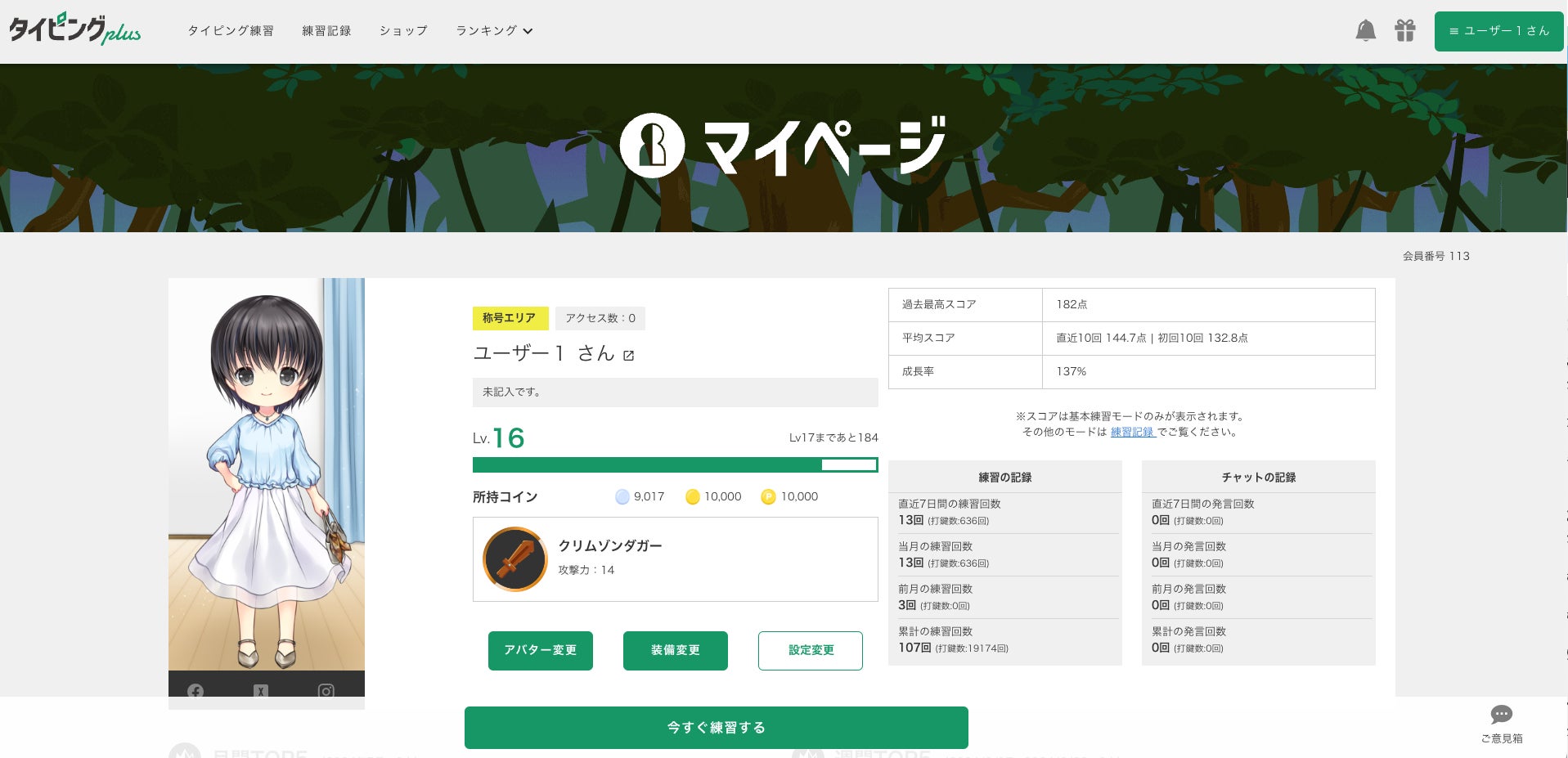 タイピングplusには、 ボス戦や装備、レベル制などのゲーミフィケーション要素をはじめ、アバター、チャット(現在開発中)など、楽しみながら継続して練習が行えます。アバター、装備品などはタイピング練習をするたびに手に入るコインで購入したり、タイピング練習後獲得アイテムとして入手することもできます。