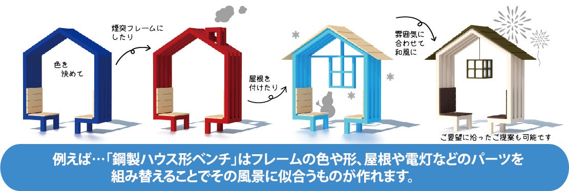 そのような思いが込められて開発された「シビックアートファニチャー」ですが、そのデザインは多種多様に作ることができます。例えば地域の名産品を型取るなどフレームの形や色、屋根や電灯などのパーツを組み替えることで、お客様のニーズに合わせたベンチを展開することが可能となっております。