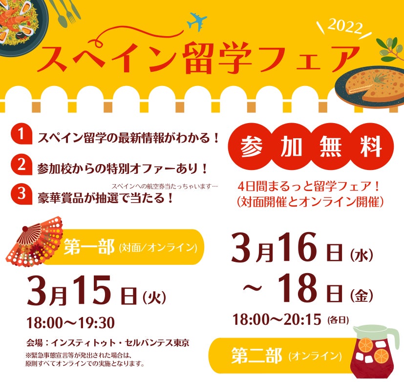 スペインの学校担当者の話が直接聞けて、豪華賞品が抽選であたる、無料の「スペイン留学フェア2022」を3月15日~18日に開催