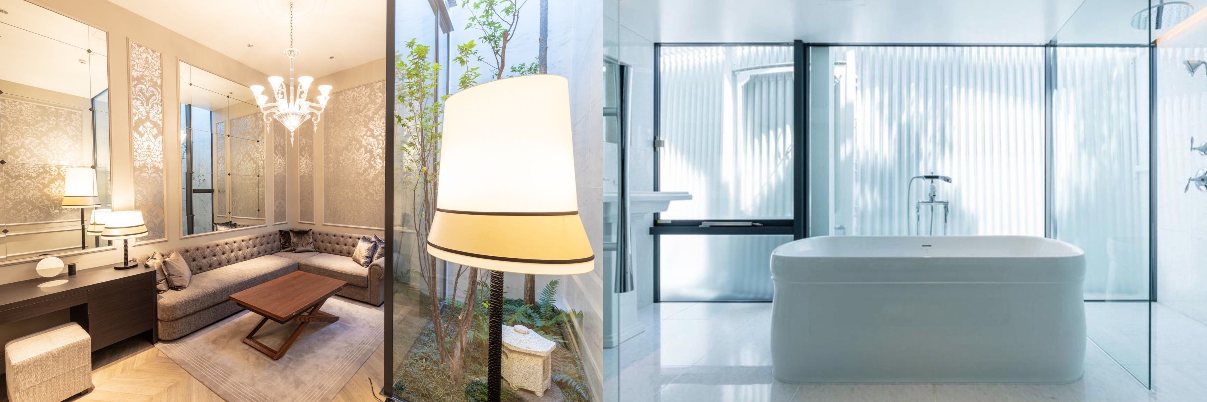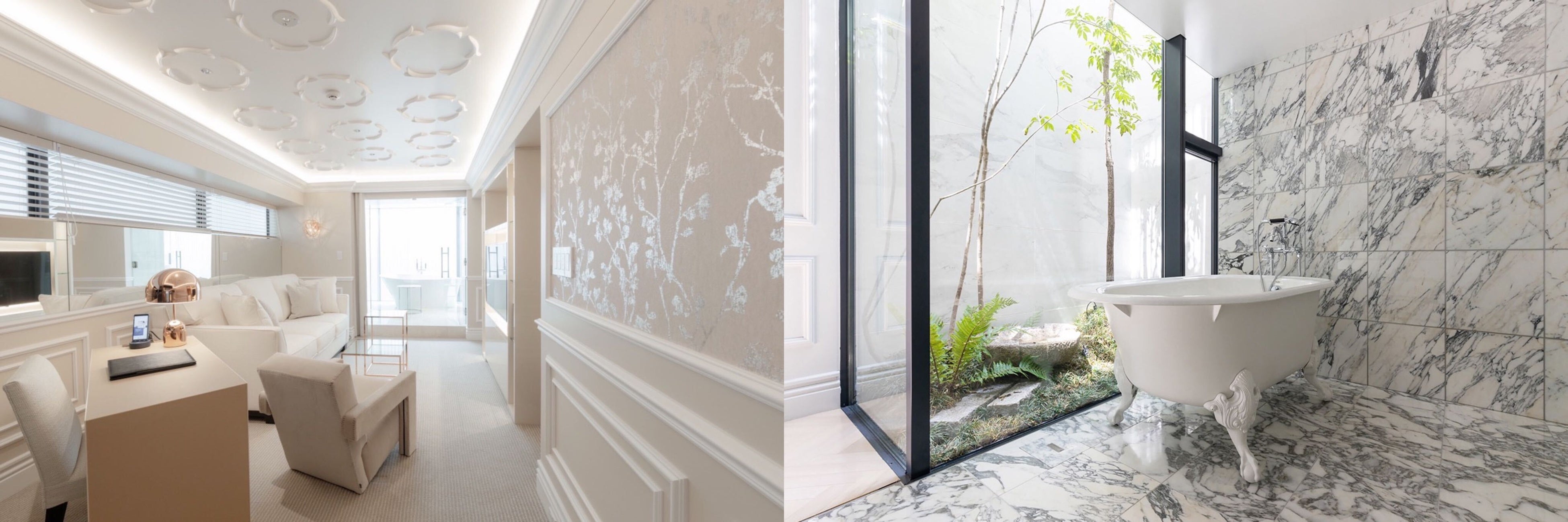 日本の繊細な季節のうつろいを表現した二十四節気から選んだカラーと、Cassina ixc.のインテリアデザインによる異なる個性的な客室。3分の1がバスルームとなっており、大理石の浴室と猫足のバスタブ、バカラのシャンデリア、イタリアのモザイクタイルなど、お部屋ごとに素材とアイテムを変えて、コンパクトながらも贅沢で特別な空間を提供しております。