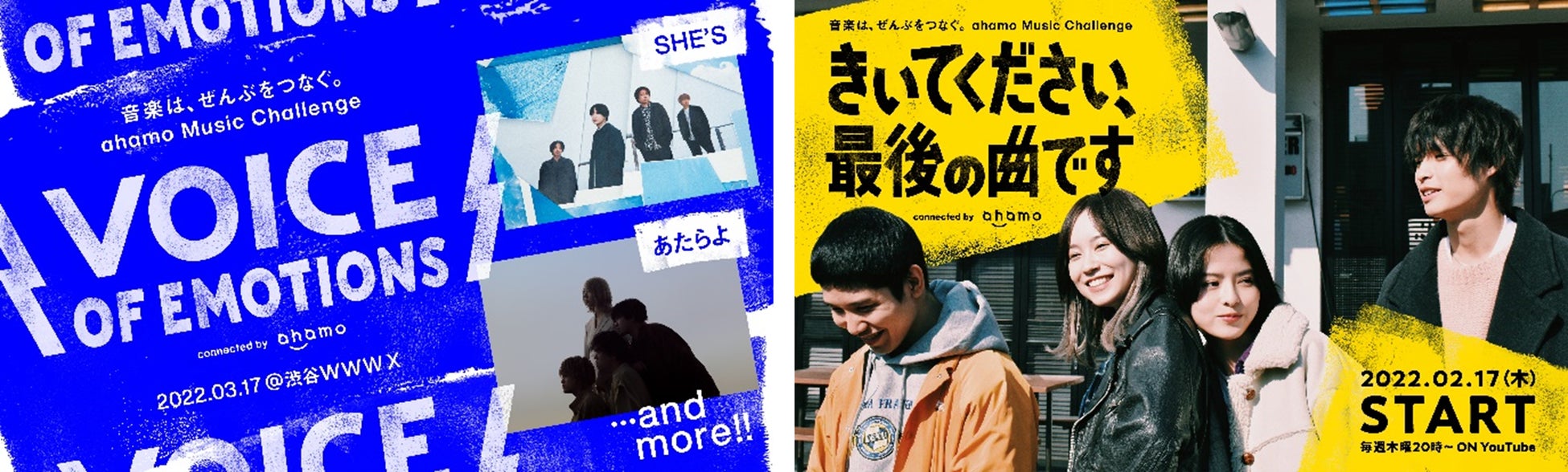 「ahamo」は、2月1日より、この春社会的に自立していく皆さま・夢に向かって新たな一歩を踏み出す皆さまを音楽を通じて応援すべく、「音楽は、ぜんぶをつなぐ」をスローガンにした『ahamo music challenge』を展開中です。第1弾プロジェクトは、3月17日(木)に渋谷 WWW Xにて開催する、プロとアマの垣根を超えた対バン形式の音楽フェス『VOICE OF EMOTIONS connected by ahamo』。そして、第2弾プロジェクトが、4つの視点で描かれる多視点青春ドラマ『きいてください、最後の曲です connected by ahamo』で、2月17日(木)より毎週木曜20時にahamo公式YouTubeチャンネルで配信してまいります。