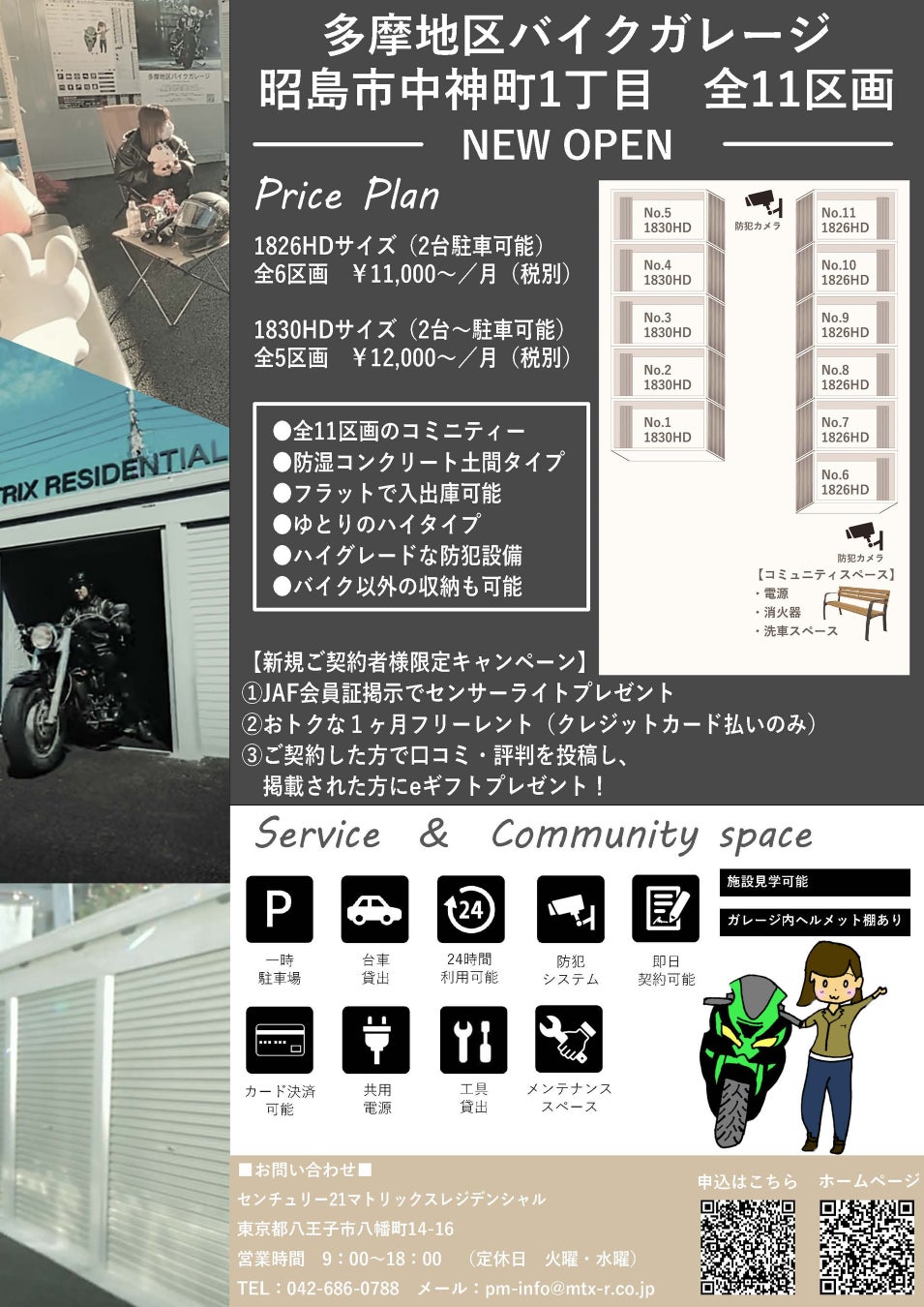 今回のご紹介は昭島市中神町バイクガレージでしたが、2022年にオープンした日野本町バイクガレージ・日野市西平山バイクガレージはおかげさまで満車となりました。誠にありがとうございます。