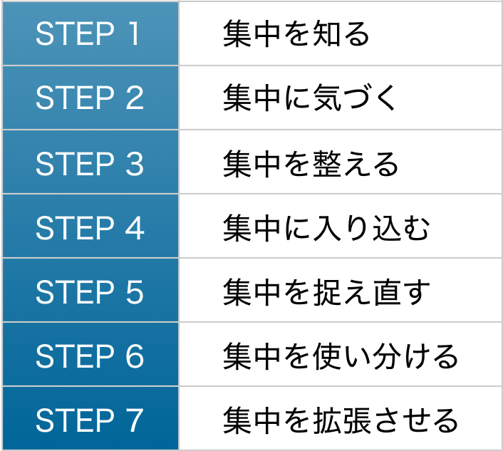 集中を「没頭集中」「熟考集中」「リラックス集中」の3つの分類に定義し、これらを必要な場面に応じて使い分けることを目指します。集中力アップに向けて7段階の学習ステップを構築。各ステップには、集中をマスターするためのノウハウやヒントが数多く存在します。