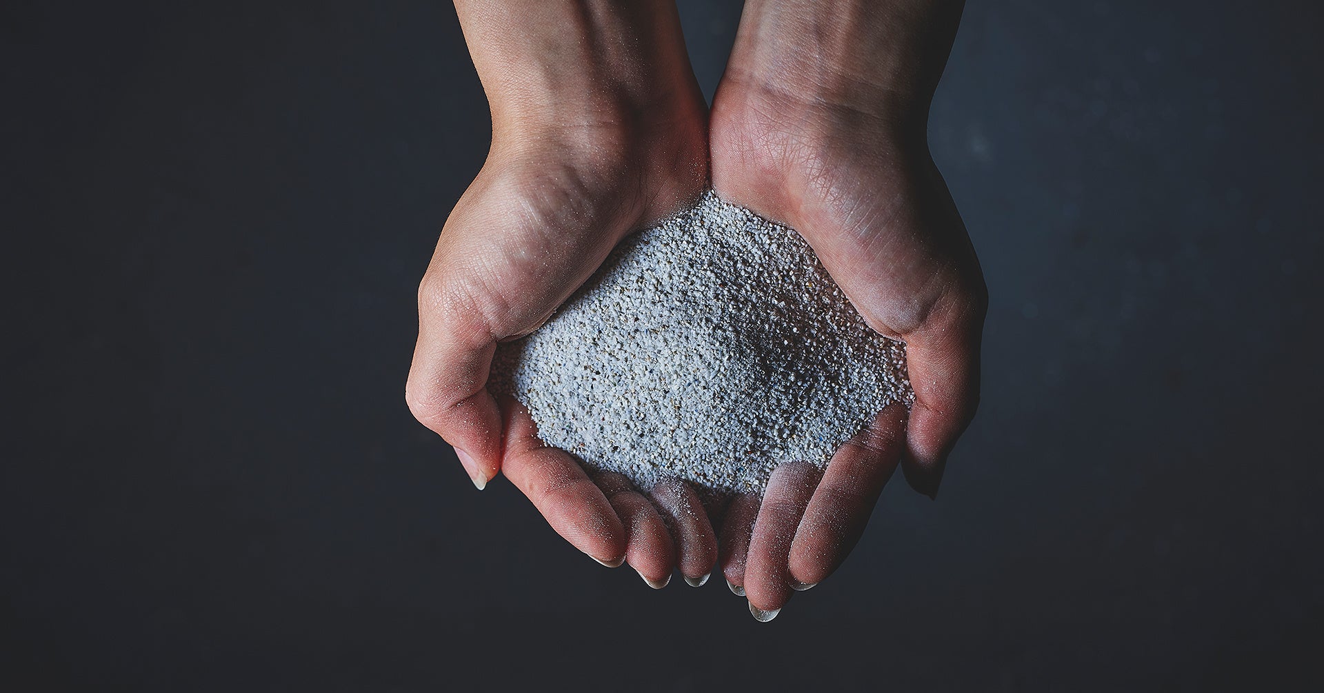 日本一の陶磁器生産量であるならば、日本一リサイクルしたい。そんな想いで始まったこのプロジェクト。一般の家庭から回収した土器以外の陶磁器や炻器などを専門の業者が粉砕し、陶磁器から再び「土」として生まれ変わらせています。通常は再利用するために約0.007mmほどのパウダー状に粉砕されるのですが、crunchではあえて粗く粉砕された直径が0.0625〜1mmほどの砂粒大のものを使用しています。リサイクルの土だけで形づくることは難しいものの試行錯誤の上、crunchは全体の20%に廃棄されるはずの陶器を混ぜて焼き上げることに成功しました。