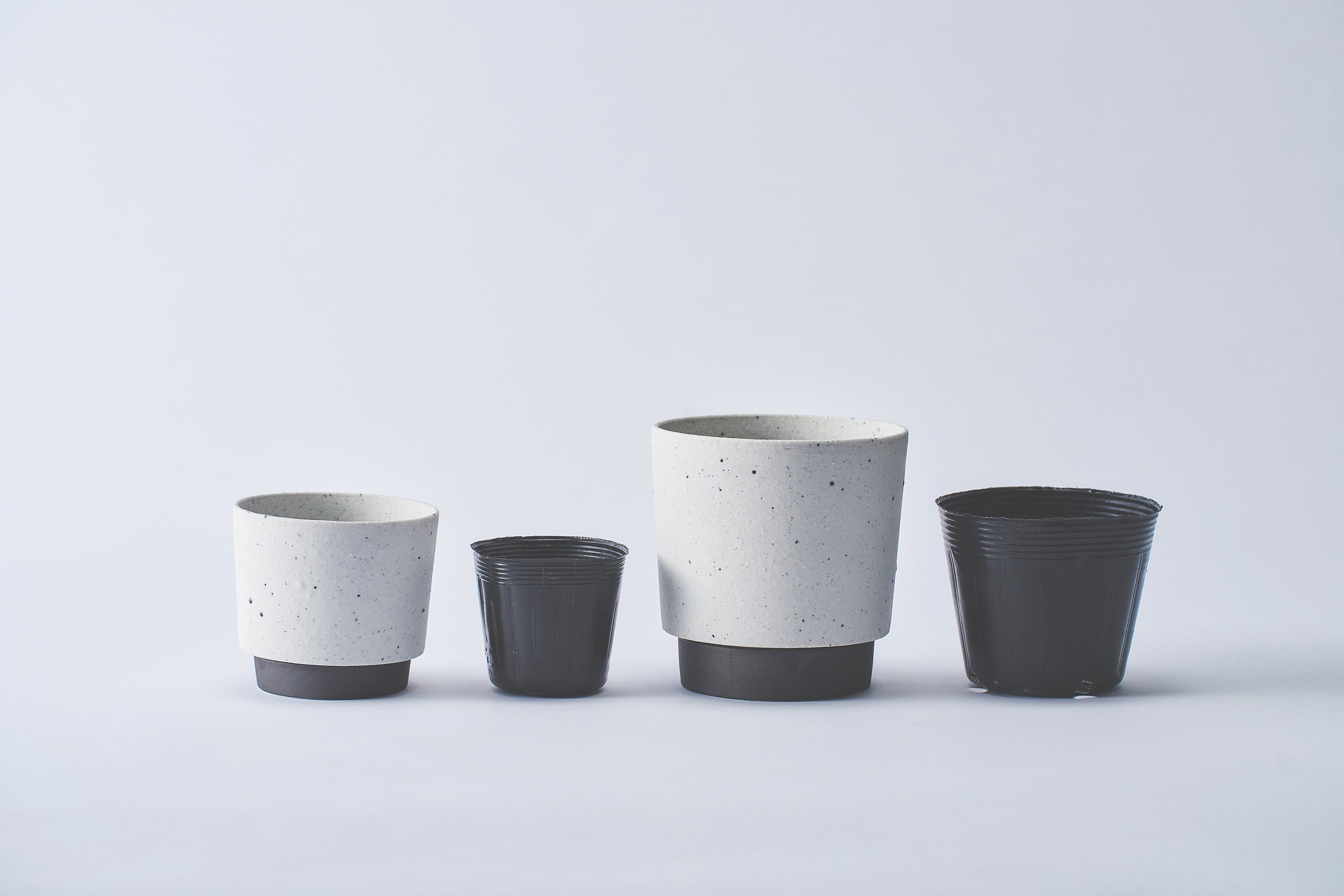 crunchはあえて量産品のようなムダのないシンプルな形にすることで、リサイクルされた土の表情や水ゴテ成形によるゆらぎをより強く感じるデザインになりました。同じような形でも一つひとつに独特のゆらぎが生まれるプランターは作家性を帯び、よりコンセプチュアル。受け皿がすっきり収まる一体型のデザインもポイントの1つです。シンプルなデザインは中に入れる植物を問わず、屋内外で植物をより美しく魅せます。さらに市販のビニールポットがそのまま入るサイズに設計されているため、植え替えの手間が要りません。