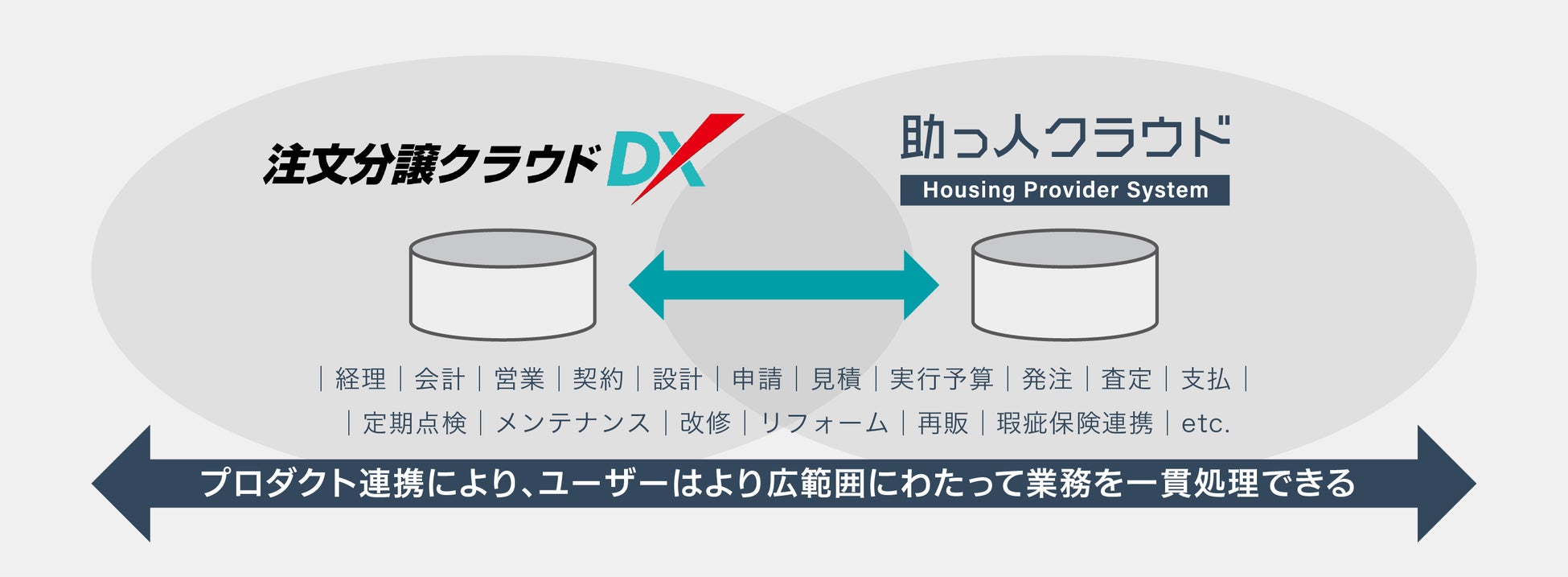 この度のプロダクト連携は、「注文分譲クラウドDX」に登録されている物件情報や顧客情報等の主要データを「助っ人クラウド」に連携するものです。これによりユーザーである住宅事業者は、両製品のメリットを最大限享受できます。住宅事業における様々な業務を、より広範囲にわたって一貫処理できるようにすることで、更なる業務効率化に貢献します。
