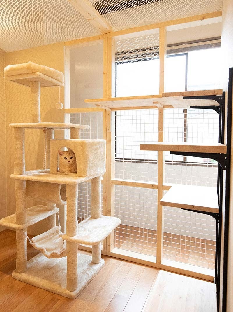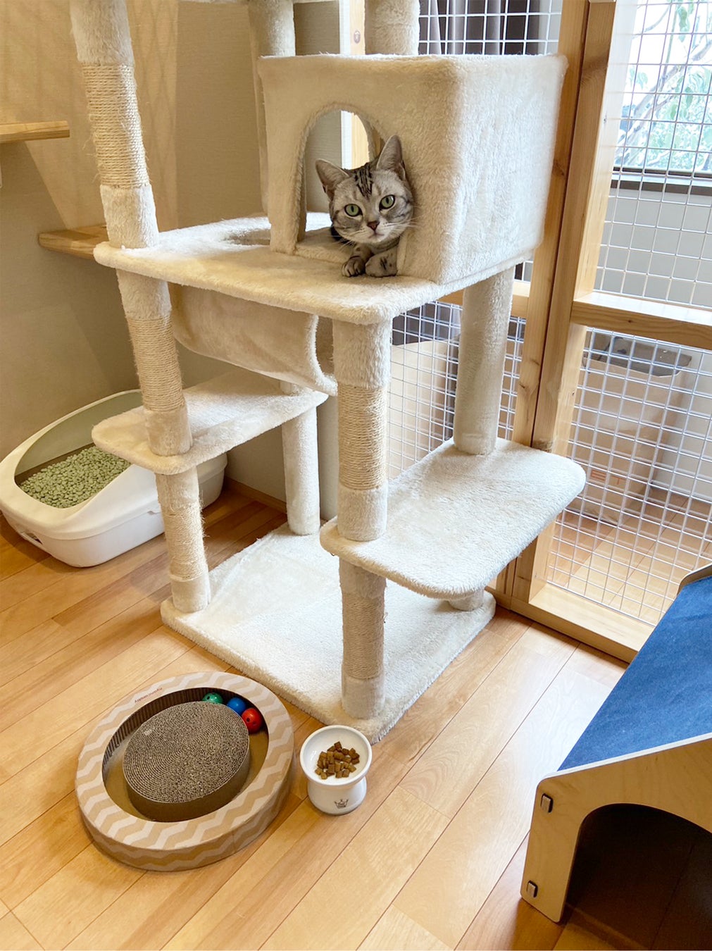 最大で4猫さままでお泊りいただける約3畳もの広さのあるお部屋になっております。猫ちゃんが喜ぶ大きな窓と、専用のキャットタワーも設備しております。