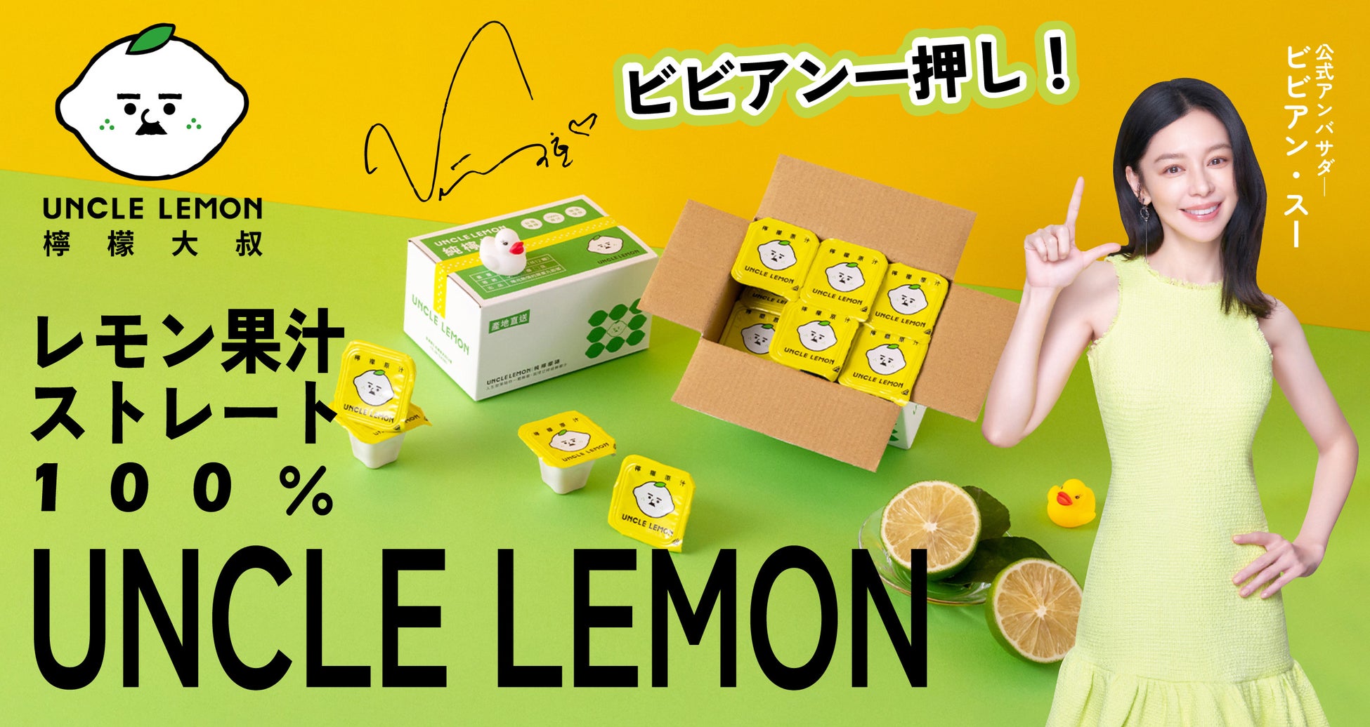 「UNCLE LEMON」というブランドは台湾産のレモンを使い、レモン果汁を生産しています。今年からViewEC Japan株式会社のパートナーとして、日本楽天市場にてレモン果汁のカプセルを販売開始します。公式アンバサダーは台湾出身で、日本では「ブラックビスケッツ」としての活動で知名度の高いビビアン・スーです。