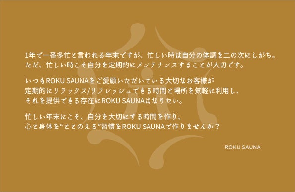 株式会社ROKU(本社:東京都千代田区、代表取締役 沖 拓史)は、非対面・非接触の完全個室のプライベートサウナ「ROKU SAUNA(ロクサウナ)たまプラーザ店」において、ユーザー様が年末の忙しい時期を健康に乗り越えていただくため、”サウナ習慣”の確立をサポートする「”ととのい習慣”サポート割」を11月16日(水)より開始します。