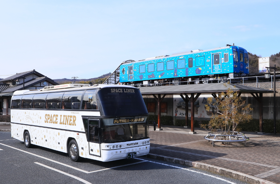また、「スタートレイン」導入に併せて造成しておりました観光バス車両「スペースライナー」(株式会社二葉観光運輸所有)も同時に運行開始いたしました。