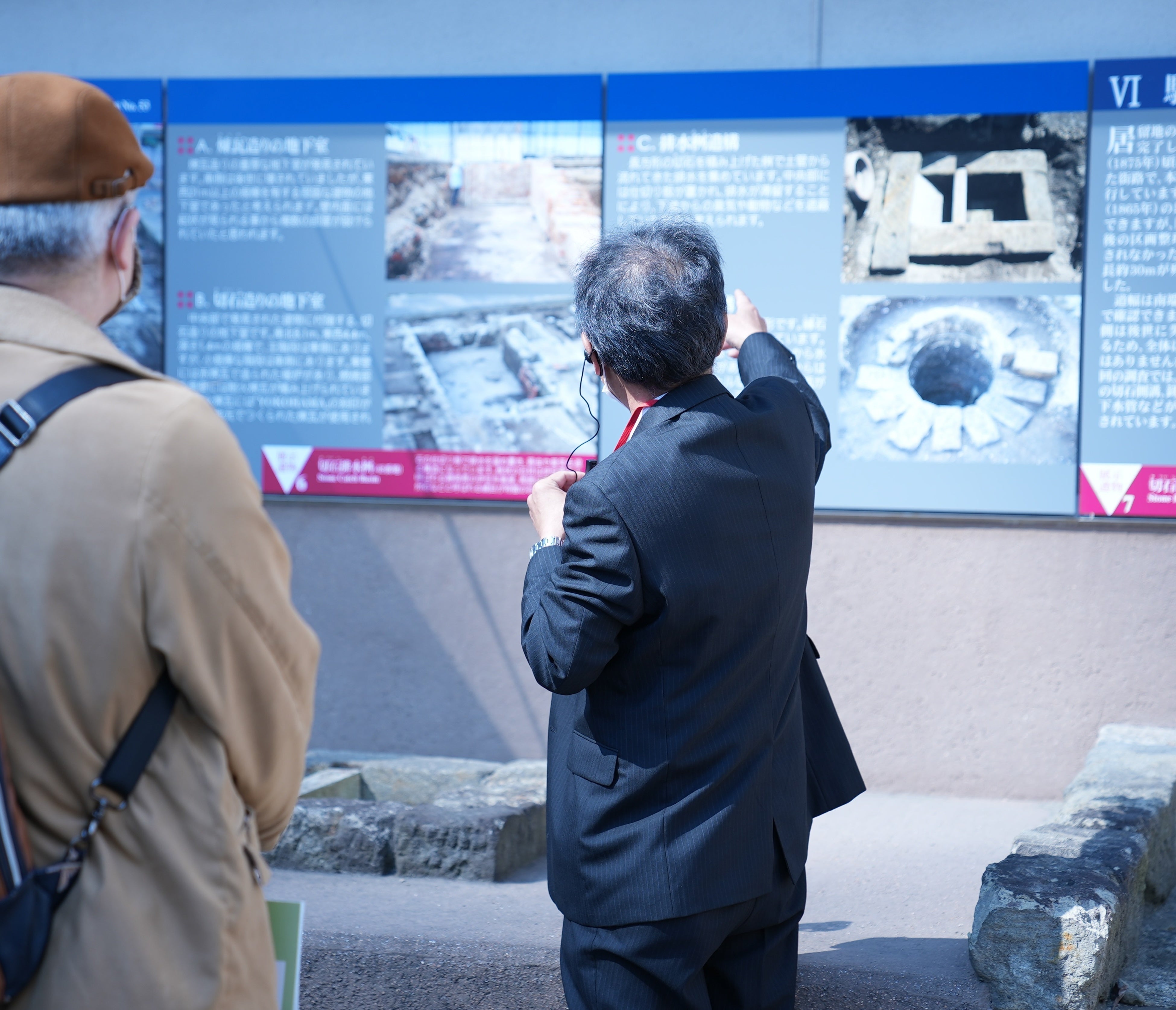 かながわ考古学財団による発掘調査がおこなわれ、開港時の横浜外国人居留地の様子が明らかになりました。山下居留地遺跡を舞台にした「タイムトラベルツアーY163」では、今から163年前、開港当初の横浜へ、発掘調査を担当したかながわ考古学財団の天野賢一さんのガイドで1時間でいっきにさかのぼります。