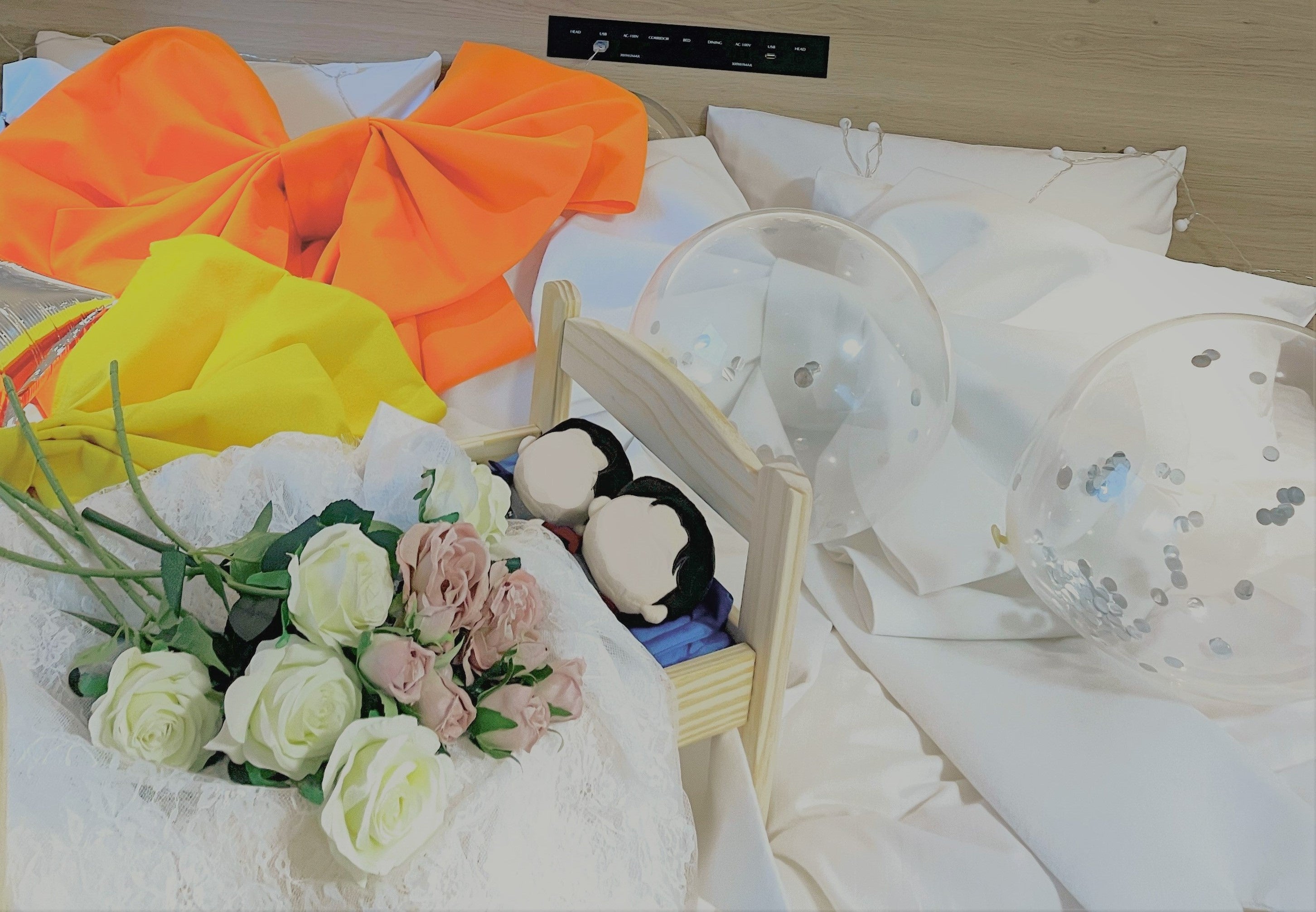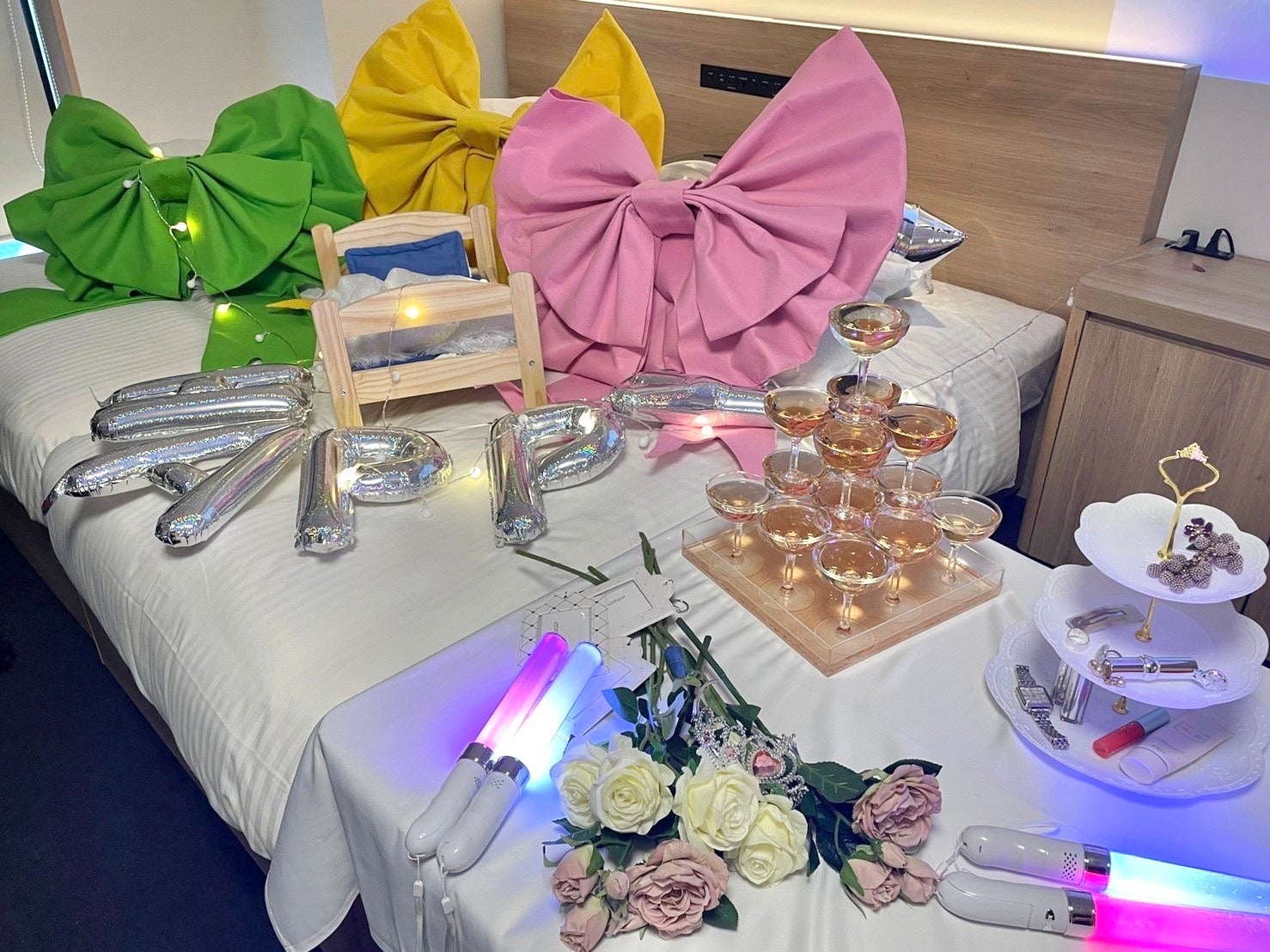 - シャンパンタワーで動画映え&「推しぬい」専用ベッドで推しと一緒に泊まれる