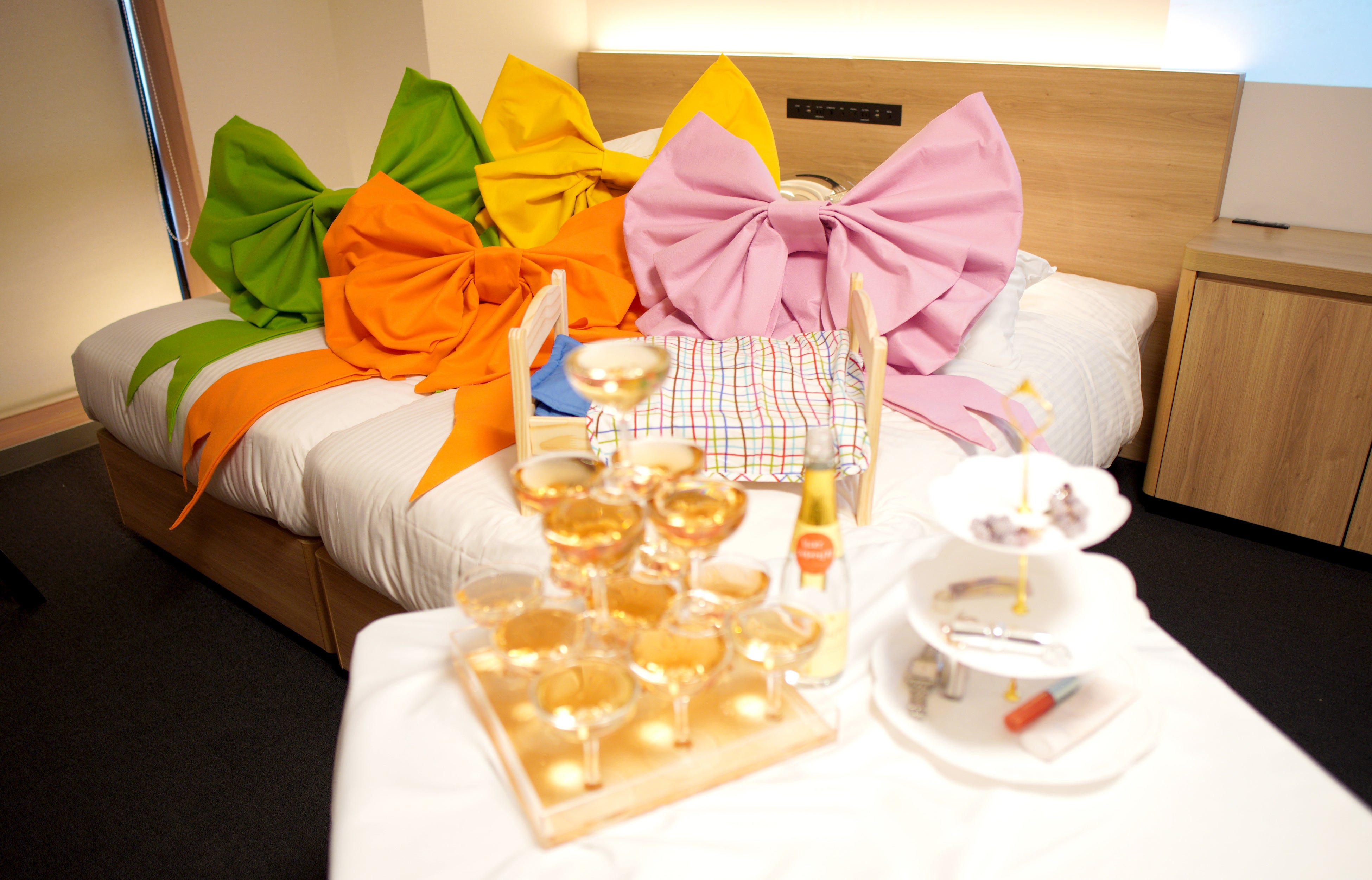 推し色ビッグリボン&シャンパンタワーで「最先端の映え」、推し専用ベッドで「推しと泊まれる」!推し活ホテルをプロデュース