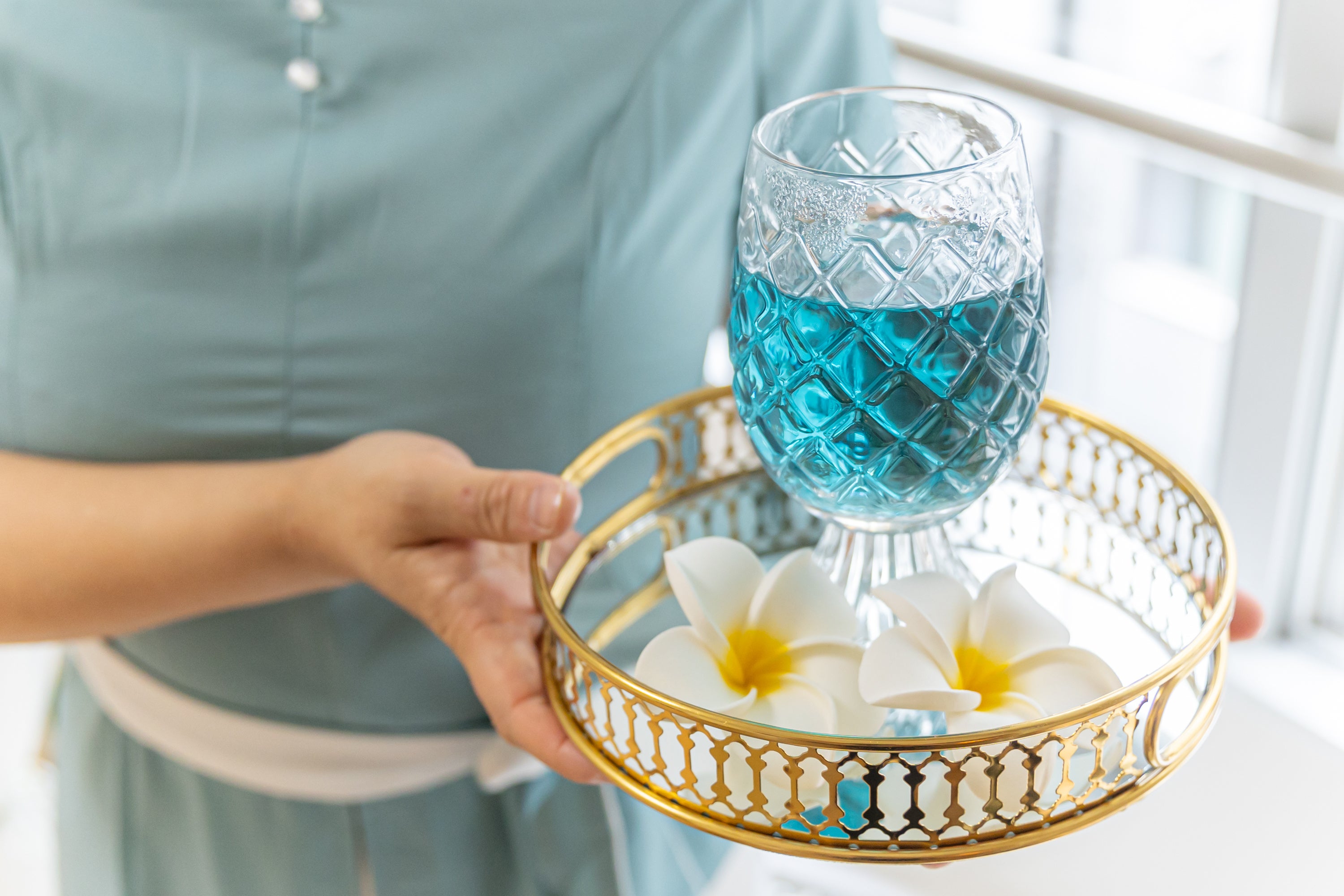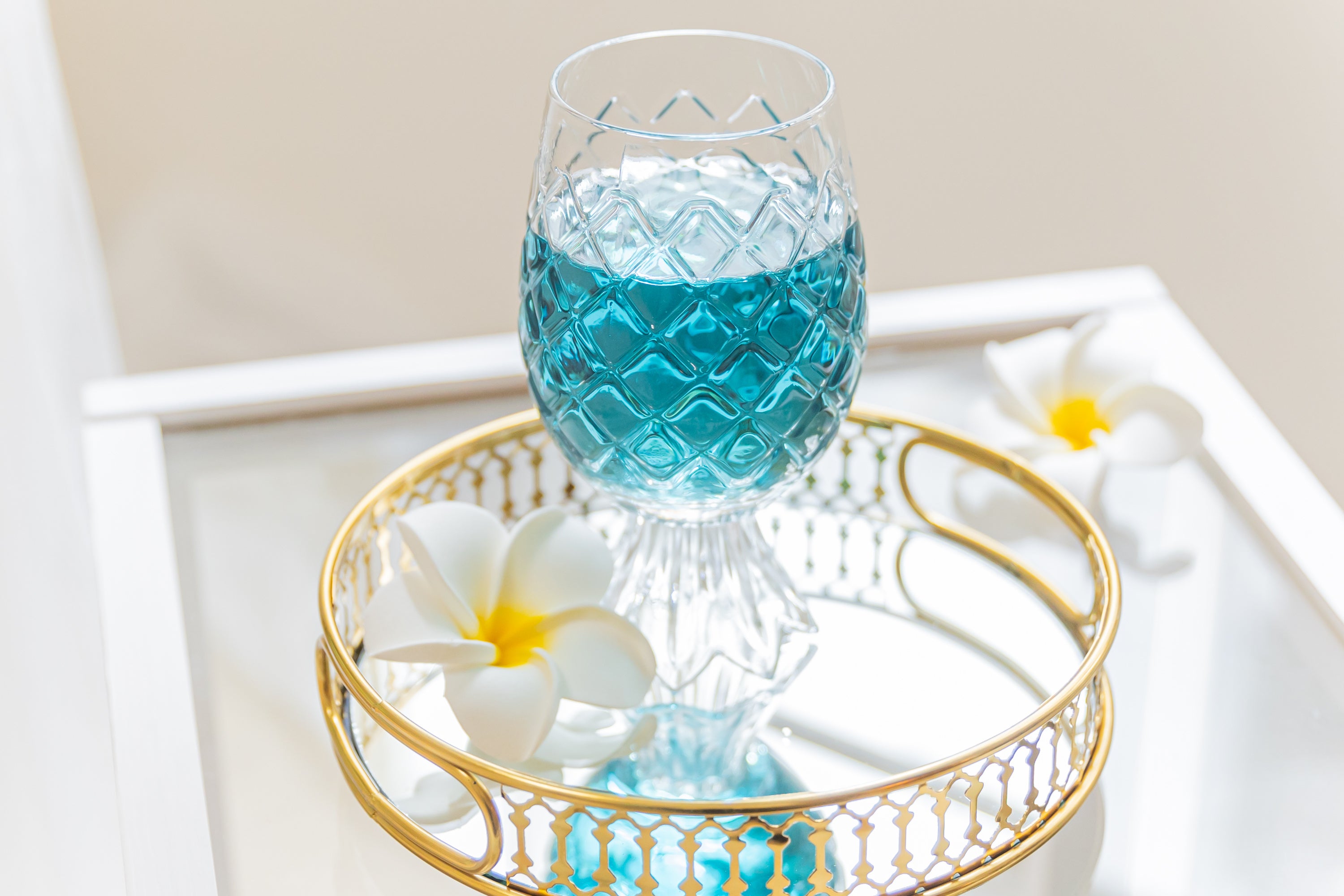 目がうるおうバタフライピーティーは天然で鮮やかな青色が特徴。クエン酸反応で紫色に変化するのを楽しめます。