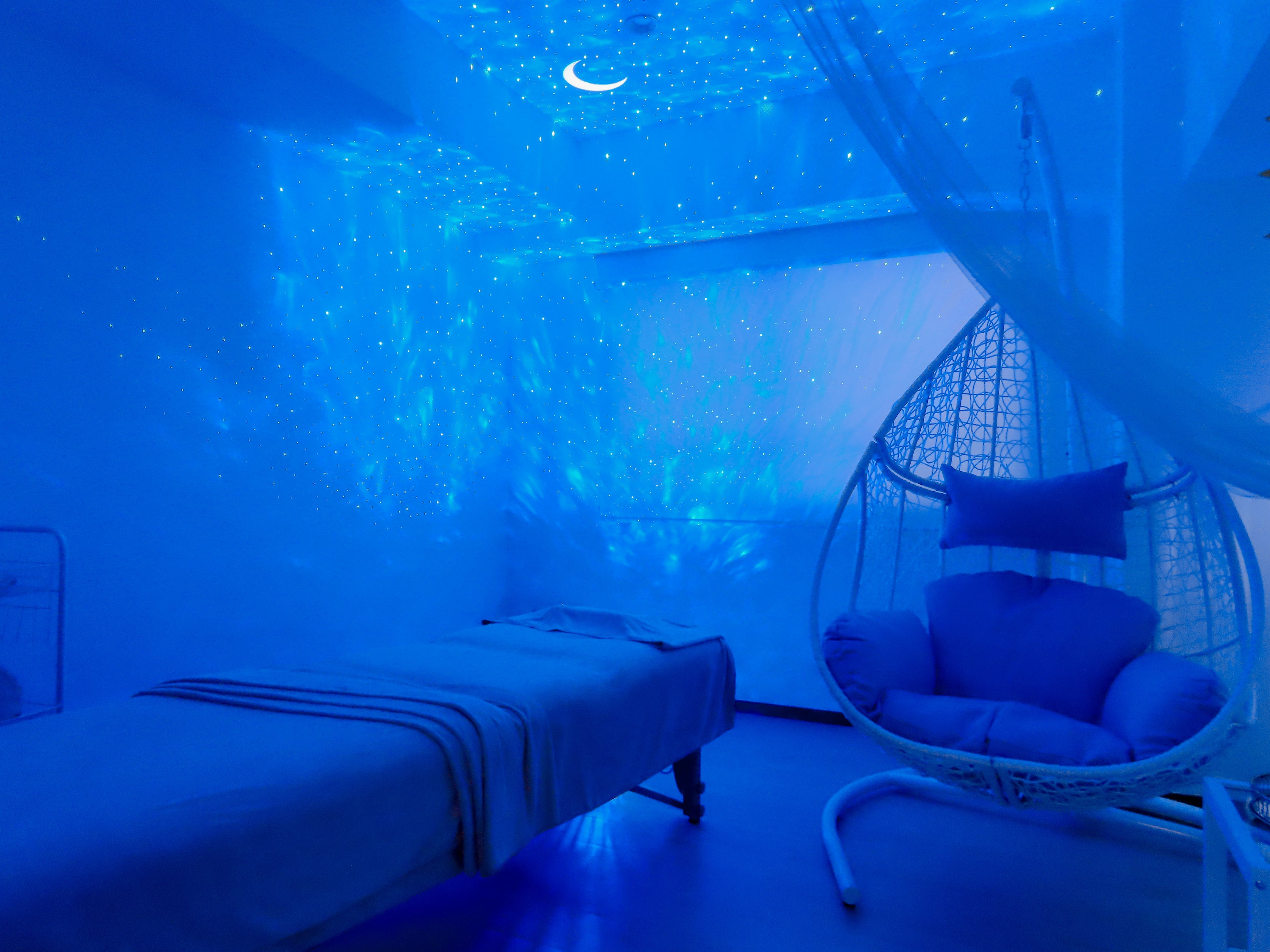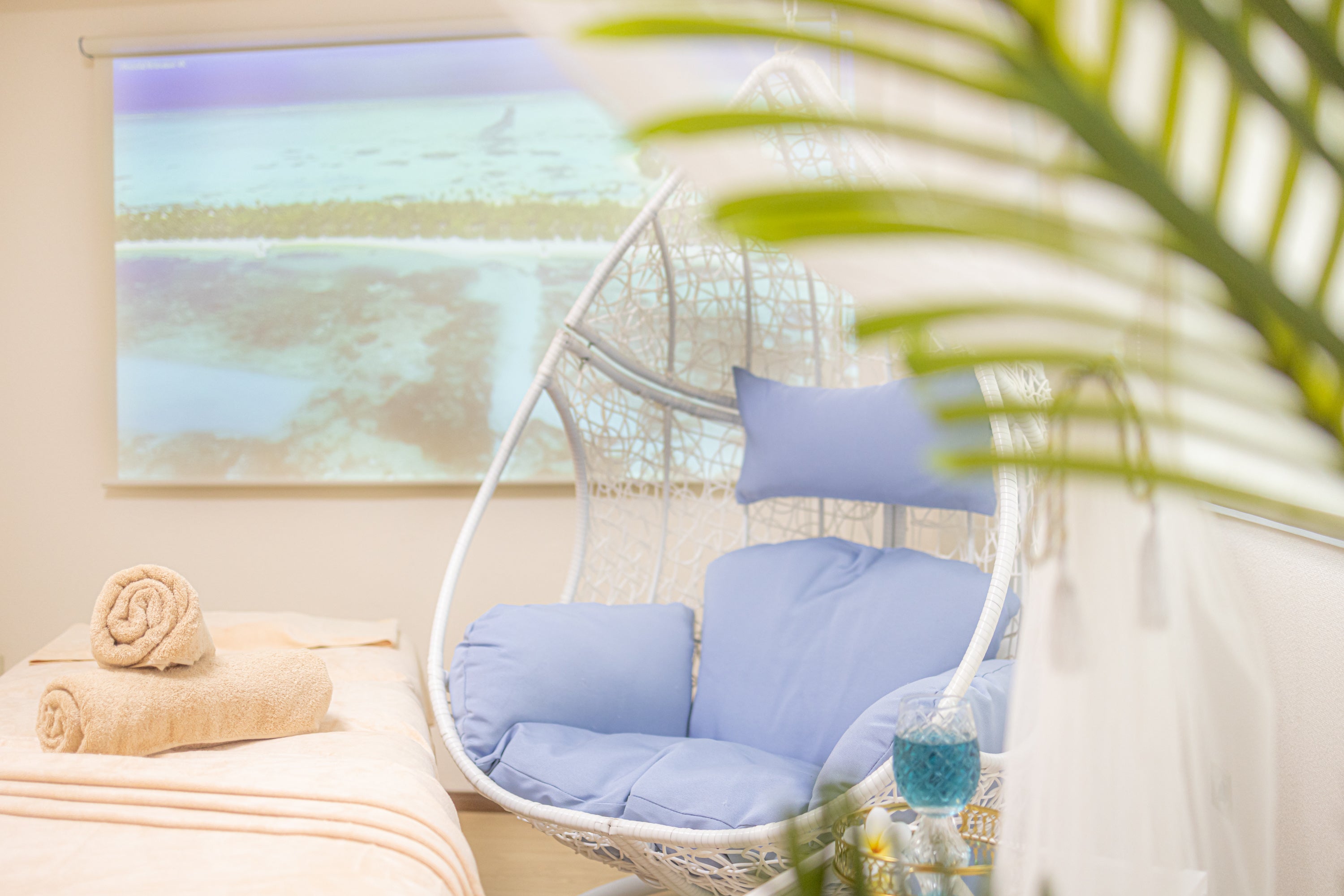 プロジェクターでモルディブの海を眺めながら、ふわふわのバスローブに包まれて、リゾートチェアにゆられたら、気分はもうリゾート!