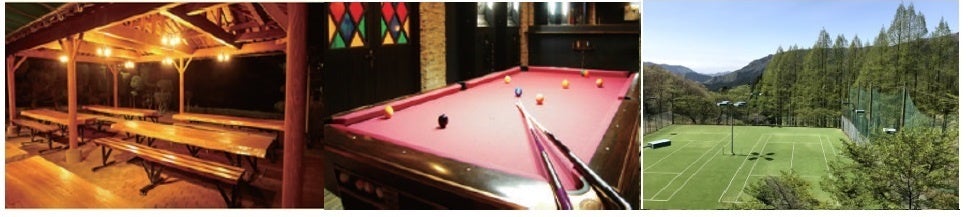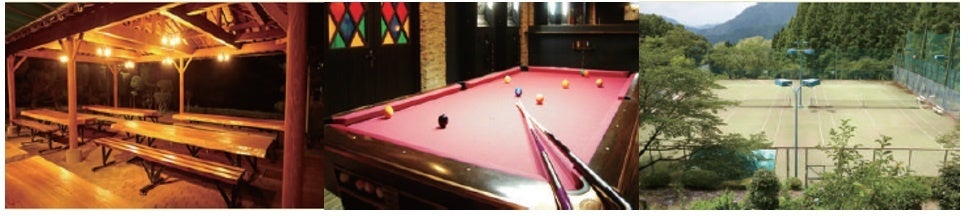 『生野高原カッセル』RVパーク施設内には、欠かせない入浴施設、24時間トイレだけでなく、テニスコート、BBQコーナー、本格洋食レストラン、自然あふれる施設に加えて、ビリヤード等屋内でお楽しみいただける施設を備えています。