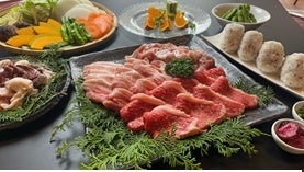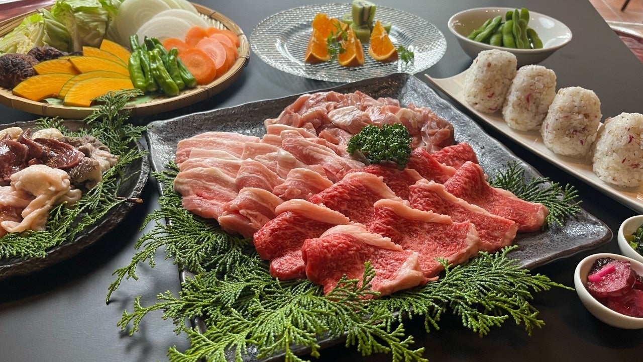 但馬牛ロース&ランプ・牛ホルモン・但馬鶏・八鹿豚・野菜盛合せ・おにぎり・枝豆・デザート付