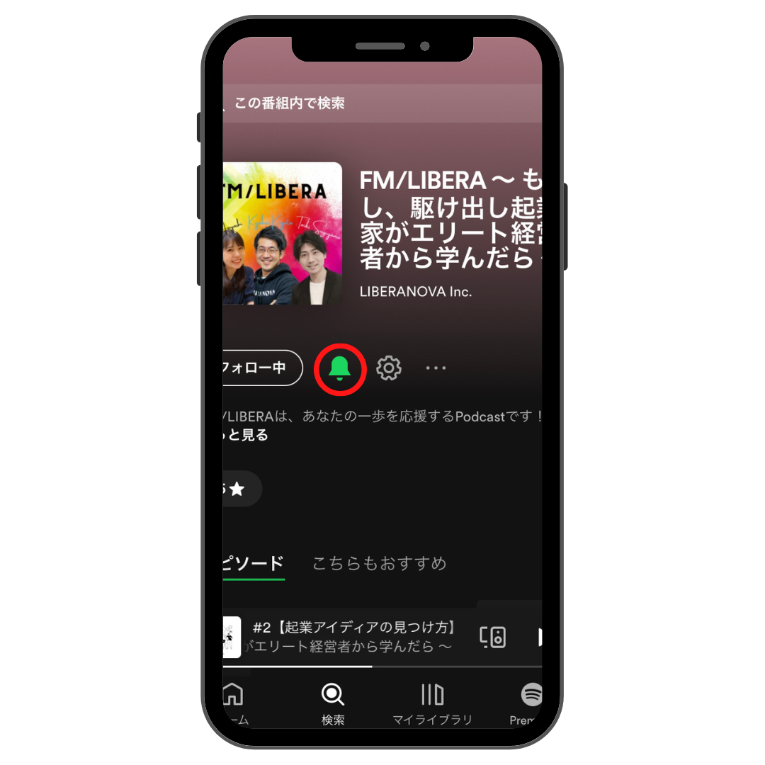 - 「フォロー」をタップして登録しておくと、「My Library」からいつでも簡単にアクセスができるようになります。また、ベルマークをタップしておくとエピソードの新着通知が届きます。