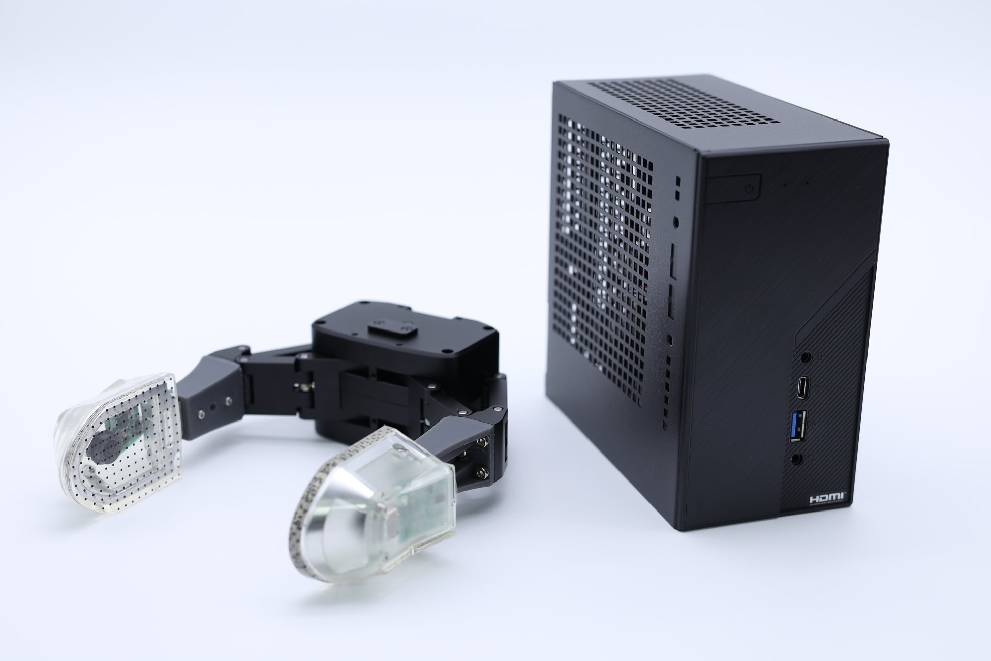 センサユニットに加えて、ロボットアーム(ROS対応)への装着・把持制御に必要なグリッパや組込制御PCを含むセットとなります。画像処理プログラムや関連ライブラリはインストール済であるため、購入後すぐにロボットアームを活用した把持制御に利用可能です。