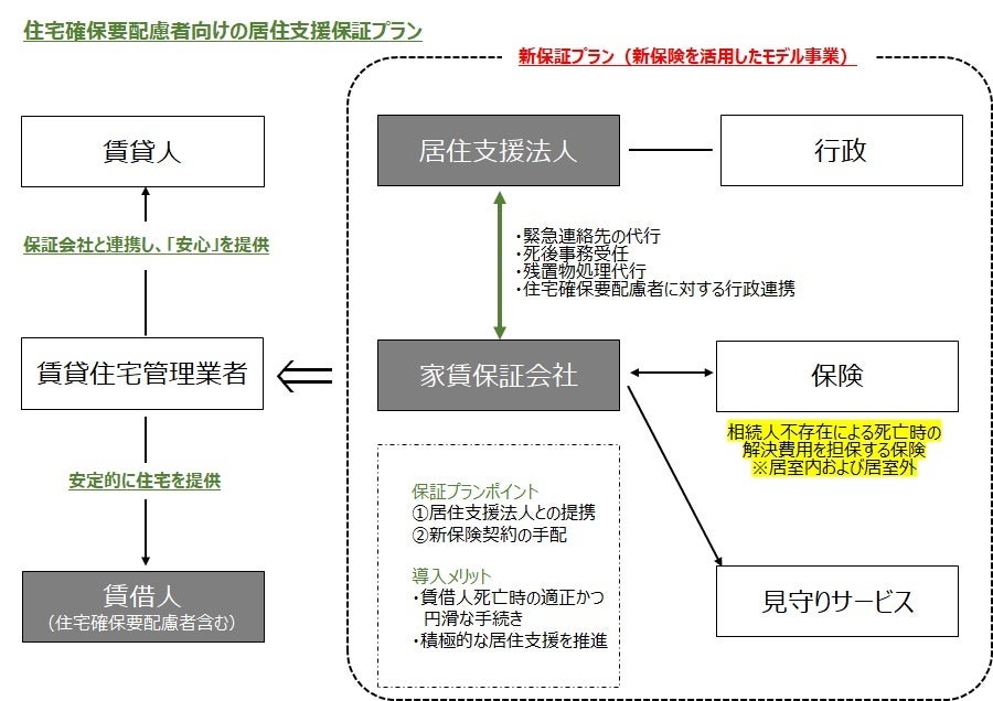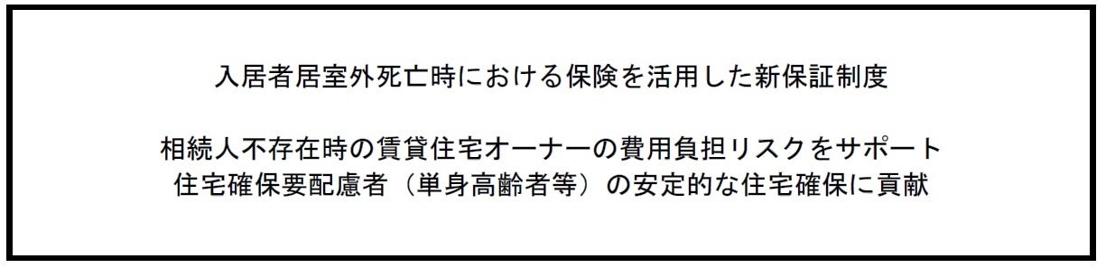 賃貸住宅の入居者が居室外で死亡した場合に生じる、相続人の捜索費用や残置物処理、原状回復等の費用を担保した居住支援保証制度の設計は事例が少なく、賃貸住宅市場に広く普及するよう取り組んでまいります。