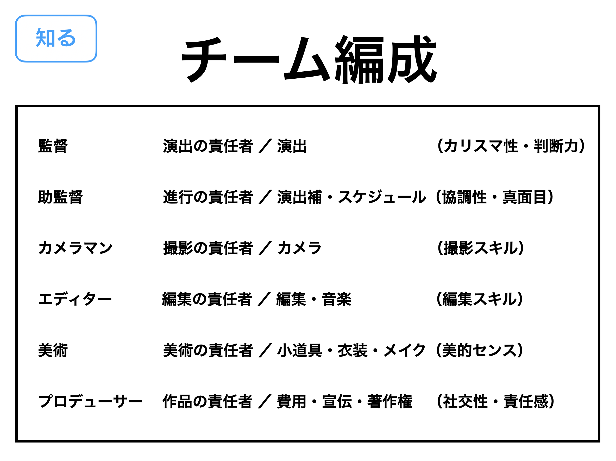 講師から動画作りの基本やシナリオの考え方などオリエンを受けた学生は、チームの強みと仲間の特性から「チーム名」と「監督・助監督・撮影・編集・美術・プロデューサー」の役割を決めて制作スタート。シナリオ制作はもちろん、撮影も編集も全て学生主体で完成を目指します。