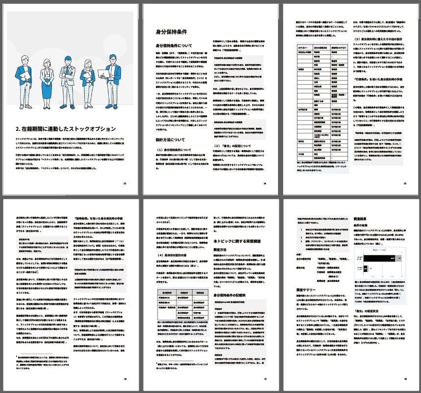 具体的にストックオプションの設計を行う担当者や専門家の方々のほかに、これからストックオプションについて学ぶ方・活用事例についてしらべている方も、内容の理解を行いながらレポートを活用いただけるように提供しております。